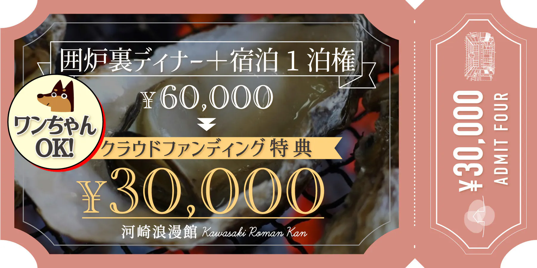 ●おいしい新鮮な佐渡産海鮮の囲炉裏ディナー2名分と河崎浪漫館の宿泊1泊分の権利です ※1