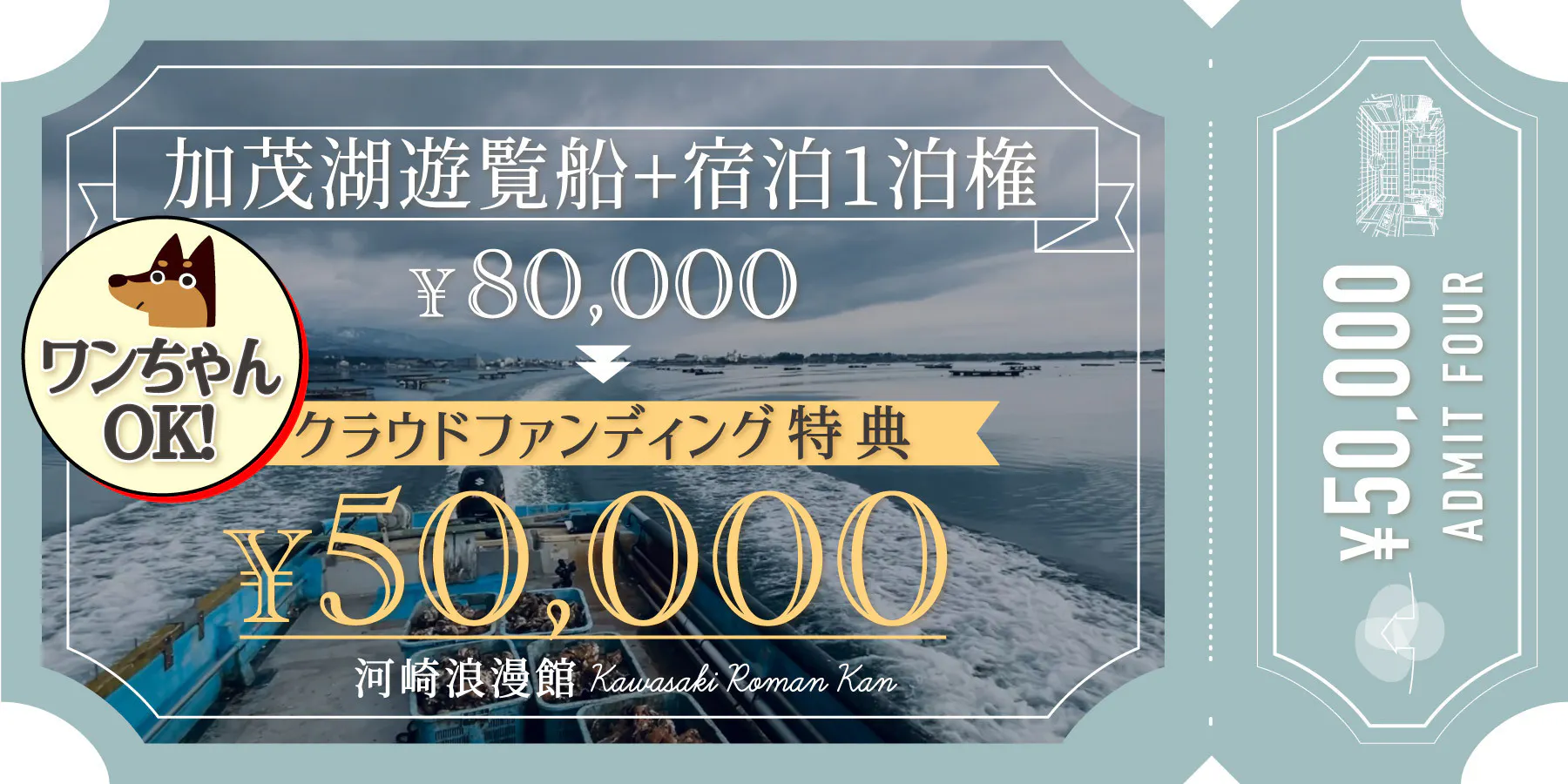 ●加茂湖の遊覧船周遊ツアーと河崎浪漫館の宿泊1泊分の権利です ※1