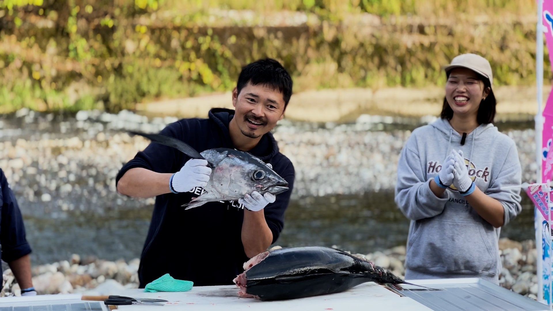 包丁を持つのも久しぶりで、考えてみたらなんと7年ぶり!(笑) 普段料理もしない僕がまぐろ解体なんて、ホントに出来るのか?と思いましたが、こんな僕が「まぐろ解体ショー」をする!と言ったら、ウケるな、笑い話になるな、と。そんな軽い気持ちでやってみましたが、キャンプ場でたくさんの人が集まってきてくれて、アチャーな失敗も含めて皆楽しんでくれました。