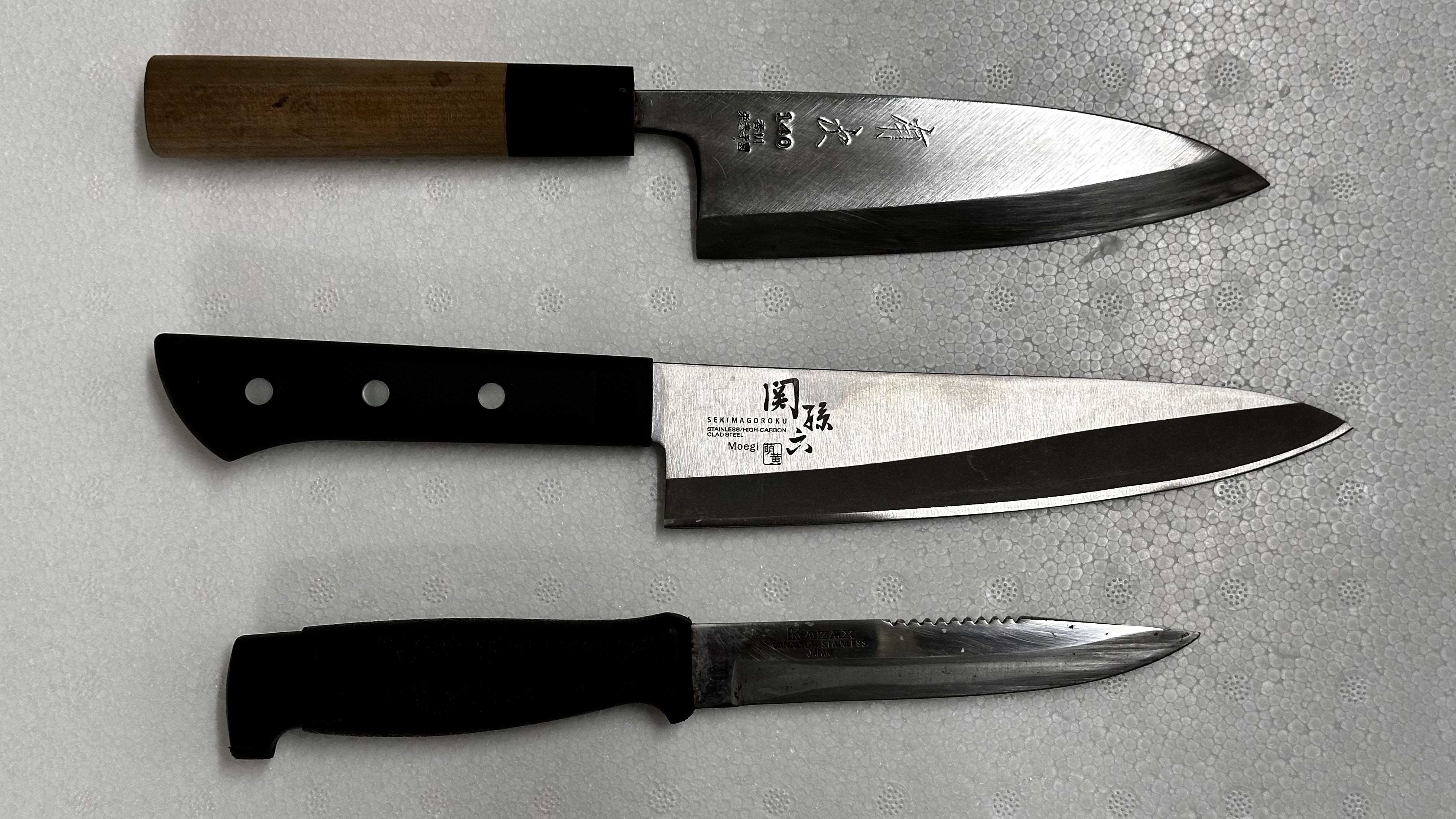 ↑普通の出刃包丁。普通の家庭で使われている三徳包丁。アウトドア用のナイフ。どれを使ってもビンチョウの解体は出来てしまうのです。ご安心を!(ただし、扱いやすいのはやはりチカラを入れやすいので、出刃包丁かな。)