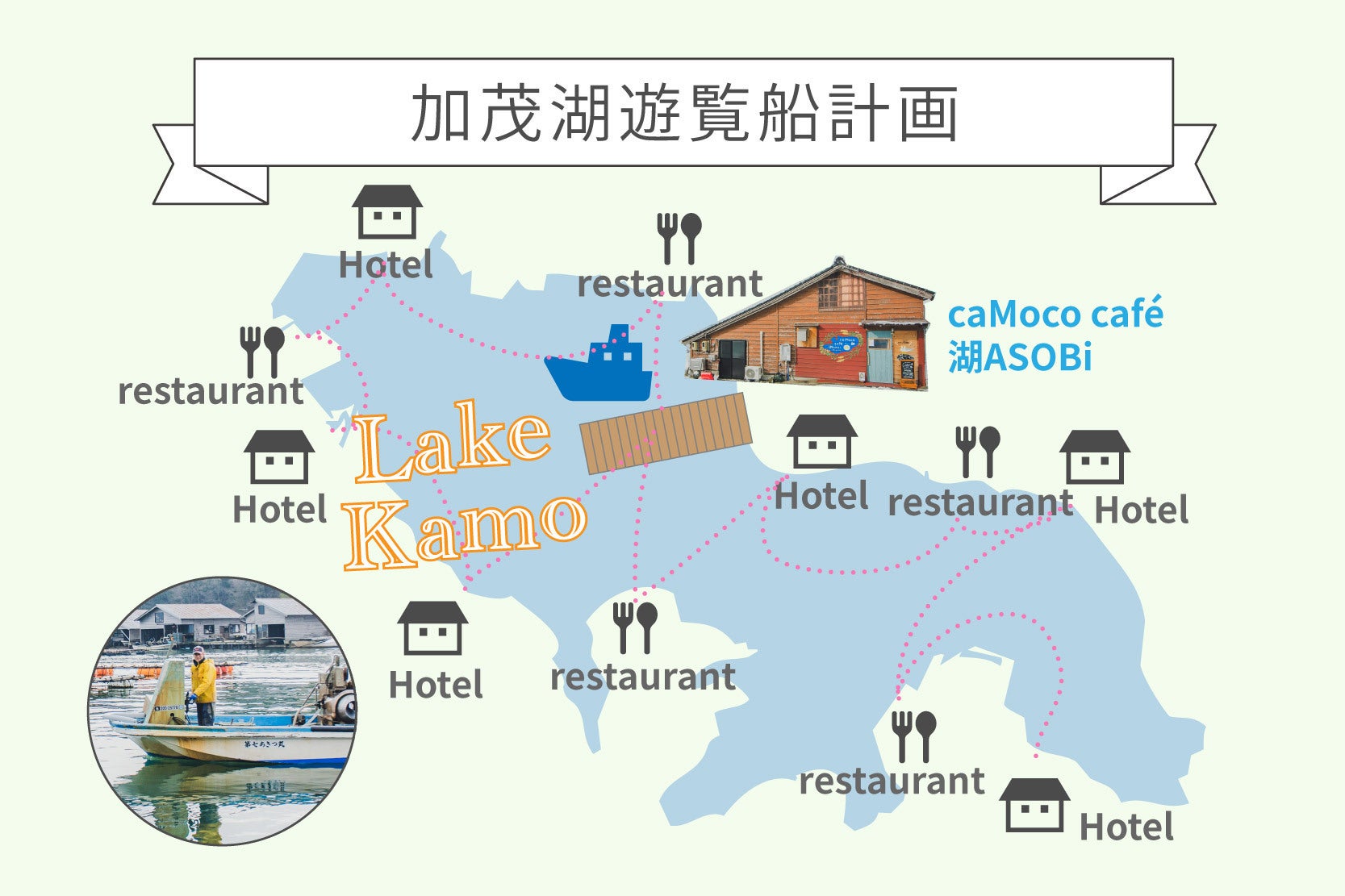 - また、加茂湖周辺のホテル・旅館・民泊との宿泊パック等にも繋げていき、他の地域には無い船で行ける宿の魅力も発信していき、加茂湖から地域全体のブランディングを実現させていきます。