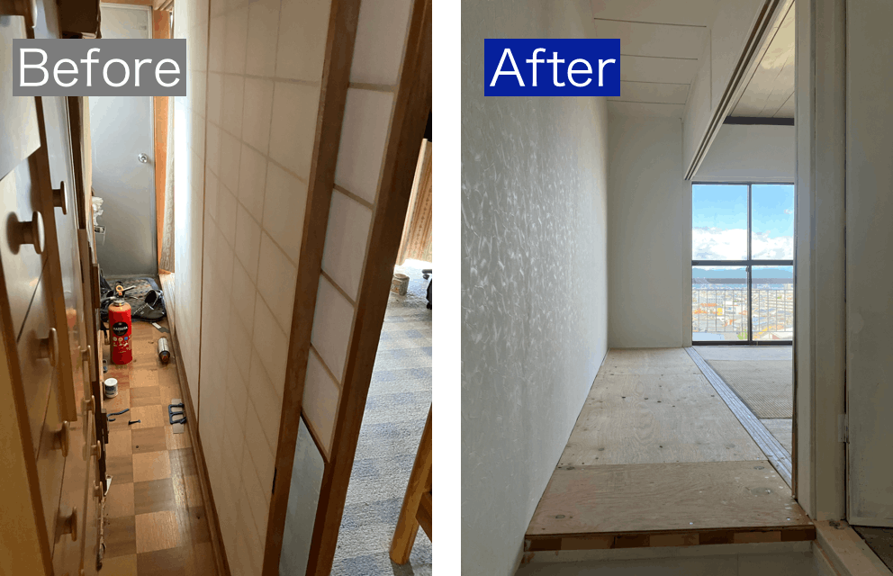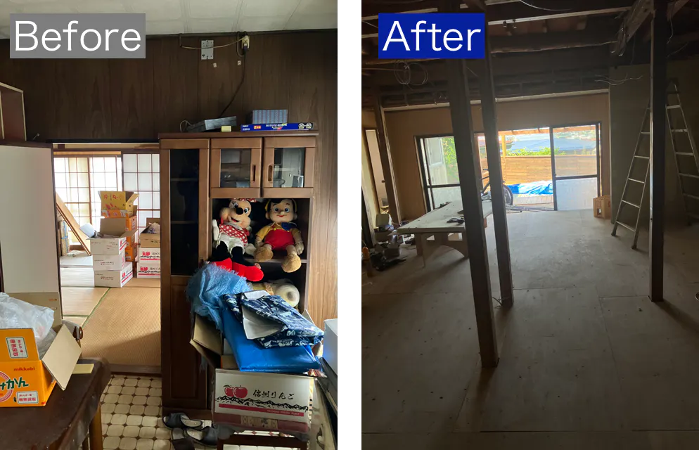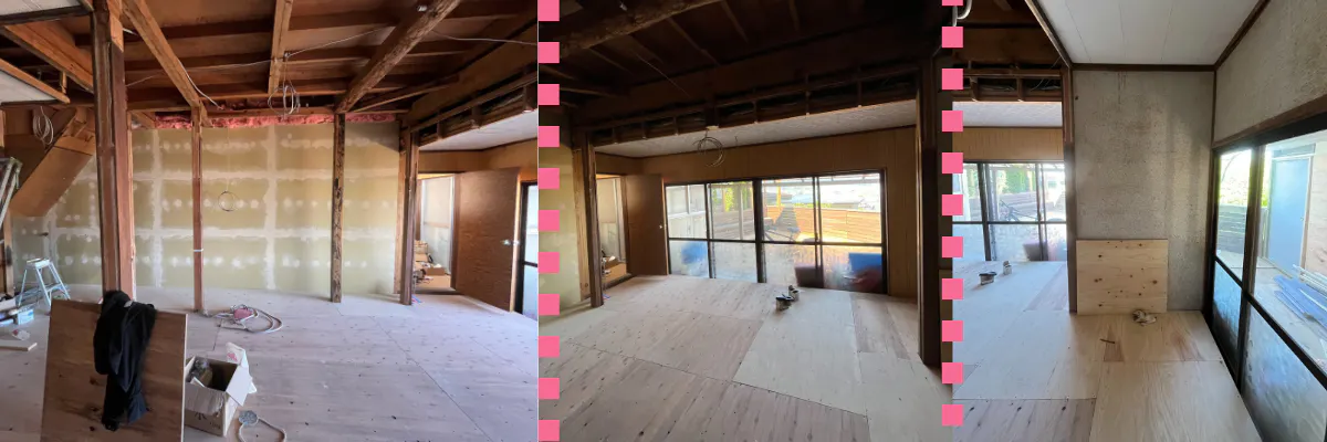・1F: 古い壁と天井を撤去して、開放感のある空間を実現しました(破壊の際は、プロ監修のもと実施)。床をコンパネで貼り直しました。広い空間にすることで、開放感あふれるリビングや、ワークスペース、寝室などを自由にレイアウトできるようになります。