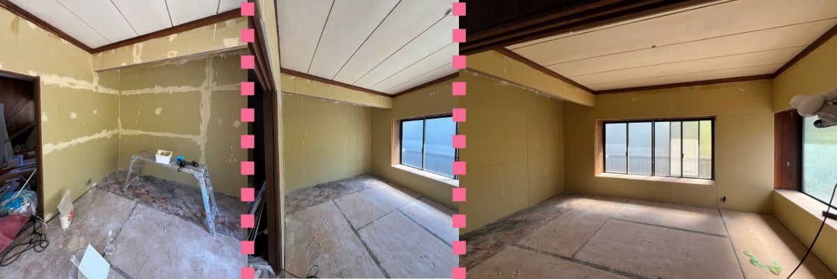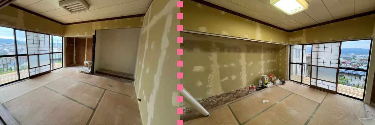 50万円の予算で眺望がいい2階の和室を、生徒さんが泊まれるスペースを作ります。ご家族と一緒にゆったりできる空間を作ります。(下図工事中の部屋)