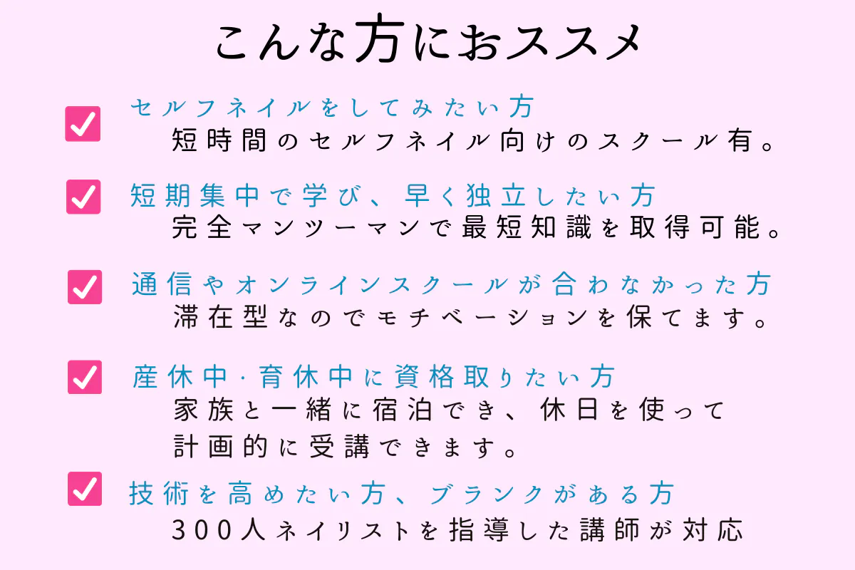 忙しい日常から離れて、充実した時間を過ごしながらネイル技術を習得しませんか?私たちの泊まれるネイルスクールは、短期間でネイリストとしての基本スキル技術を学びたい方に最適です。※宿泊ご所望の場合、シーツやタオル等のリネン類は全て持ち込みでお願いいたします。退出時に部屋の清掃も実施頂きます。