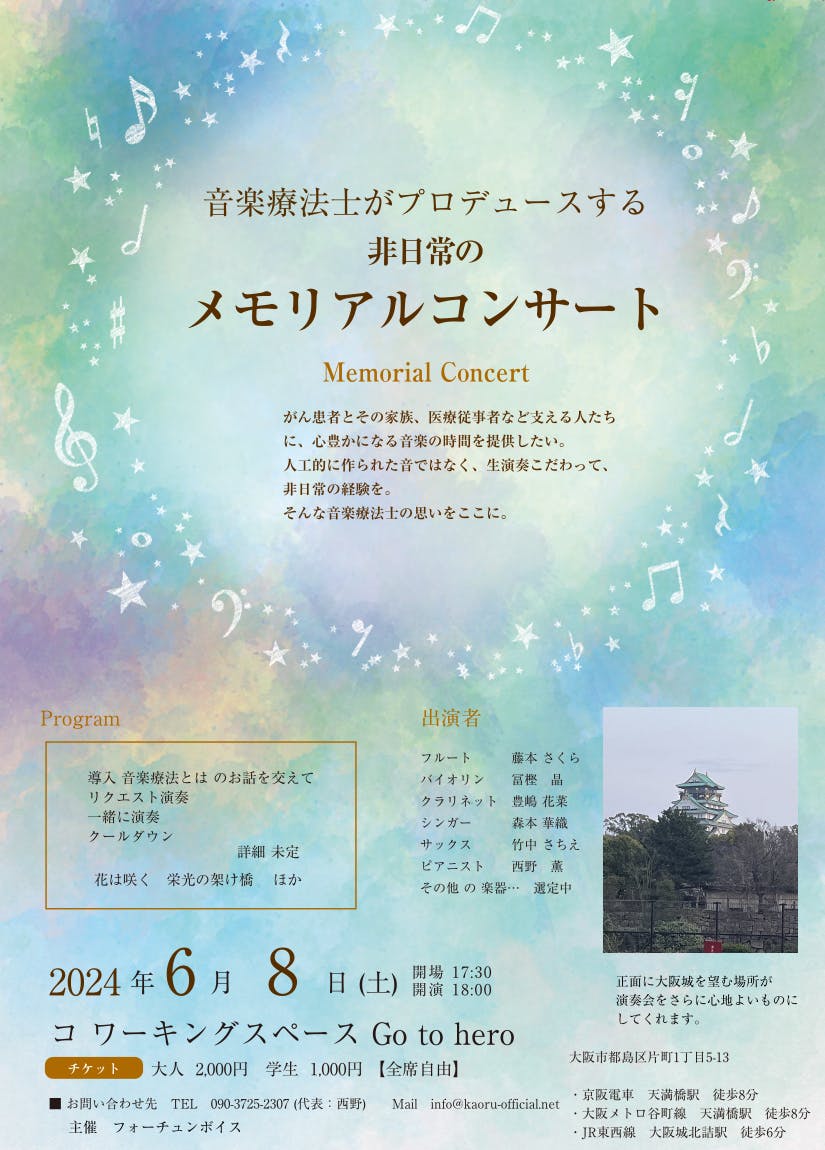そのために、2024年6月8日(土)大阪で初のコンサートを開催させて頂きます。今回、クラウドファンディングを通じて、多くの方にこの活動を知って頂きたいと考えておりますので、ぜひ応援よろしくお願いいたします。