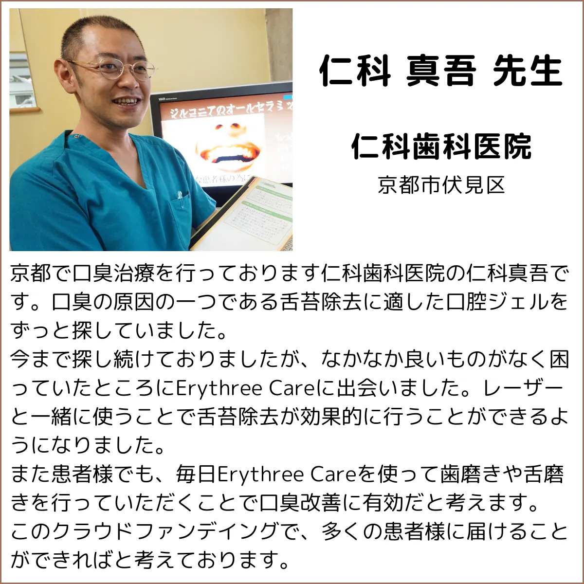 今回、口腔ケアに優れた歯磨きペーストと出会い、さらに口腔ケアの効果を高める製品Erythree Careを開発し、より口腔ケア予防の啓蒙を図りたいと思い、クラウドファンディングに挑戦しました。
