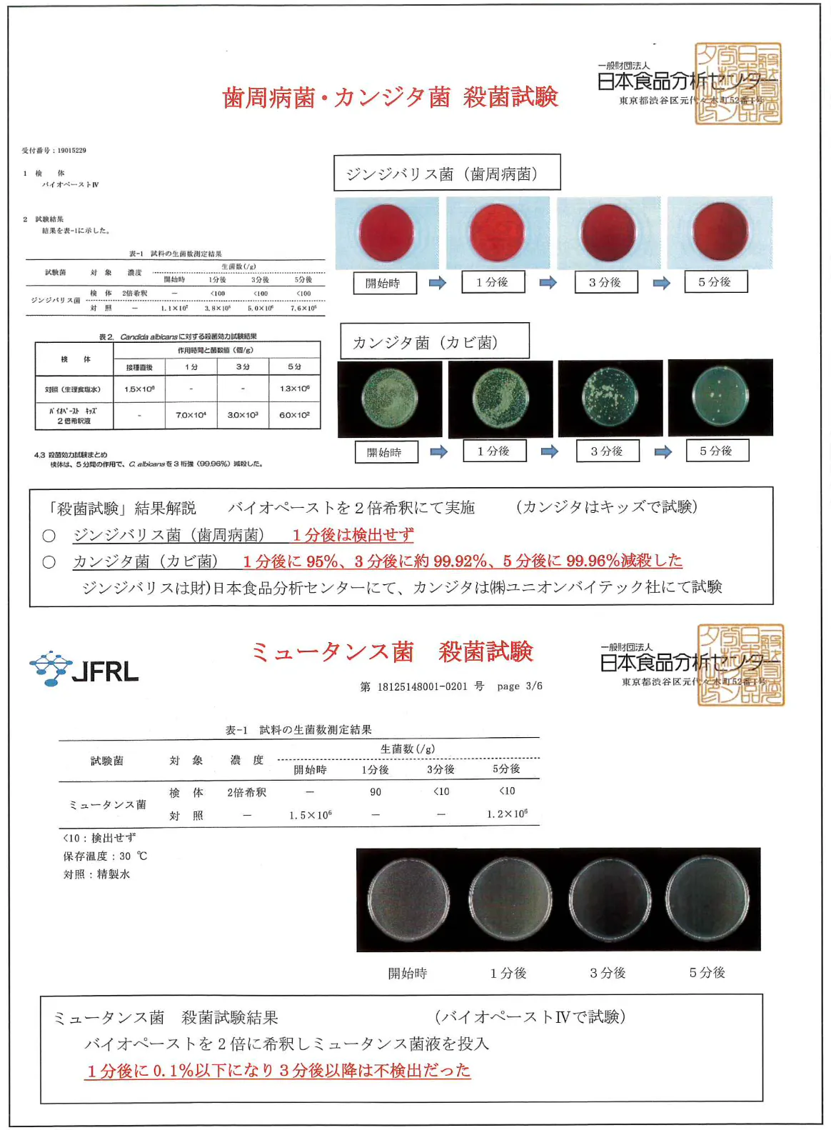 下記は、Erythree Careと同様の成分を持つバイオミネラルを使用した歯磨きペーストにおける不活性化検証の結果です。ご参考までにご覧ください。