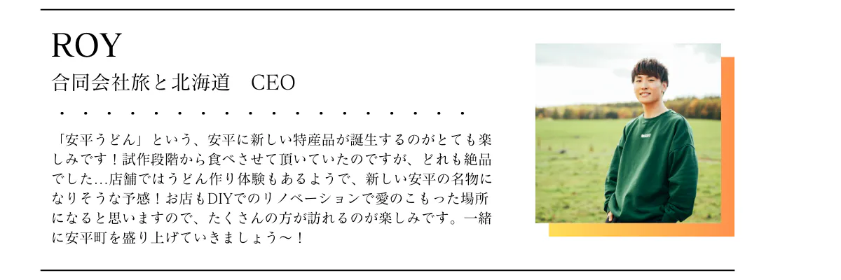 そして今回、北海道の安平町で地域おこし協力隊として、安平町から新ジャンル「北海道うどん」を展開するプロジェクトに挑戦しています。