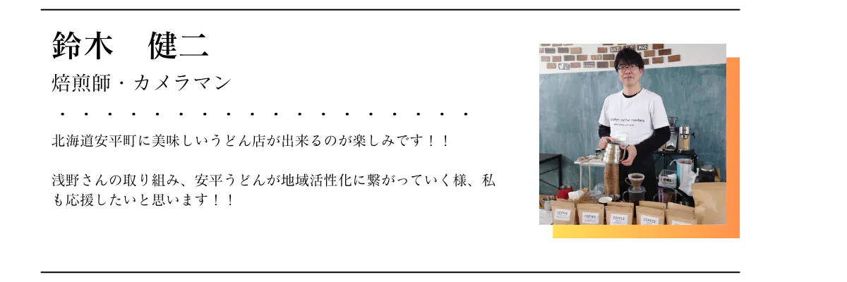 はじめまして。たくさんあるページの中から、このページをご覧いただき本当にありがとうございます。北海道で新たなうどんの文化を作るべく活動しています、安平うどん代表の浅野浩司と申します。