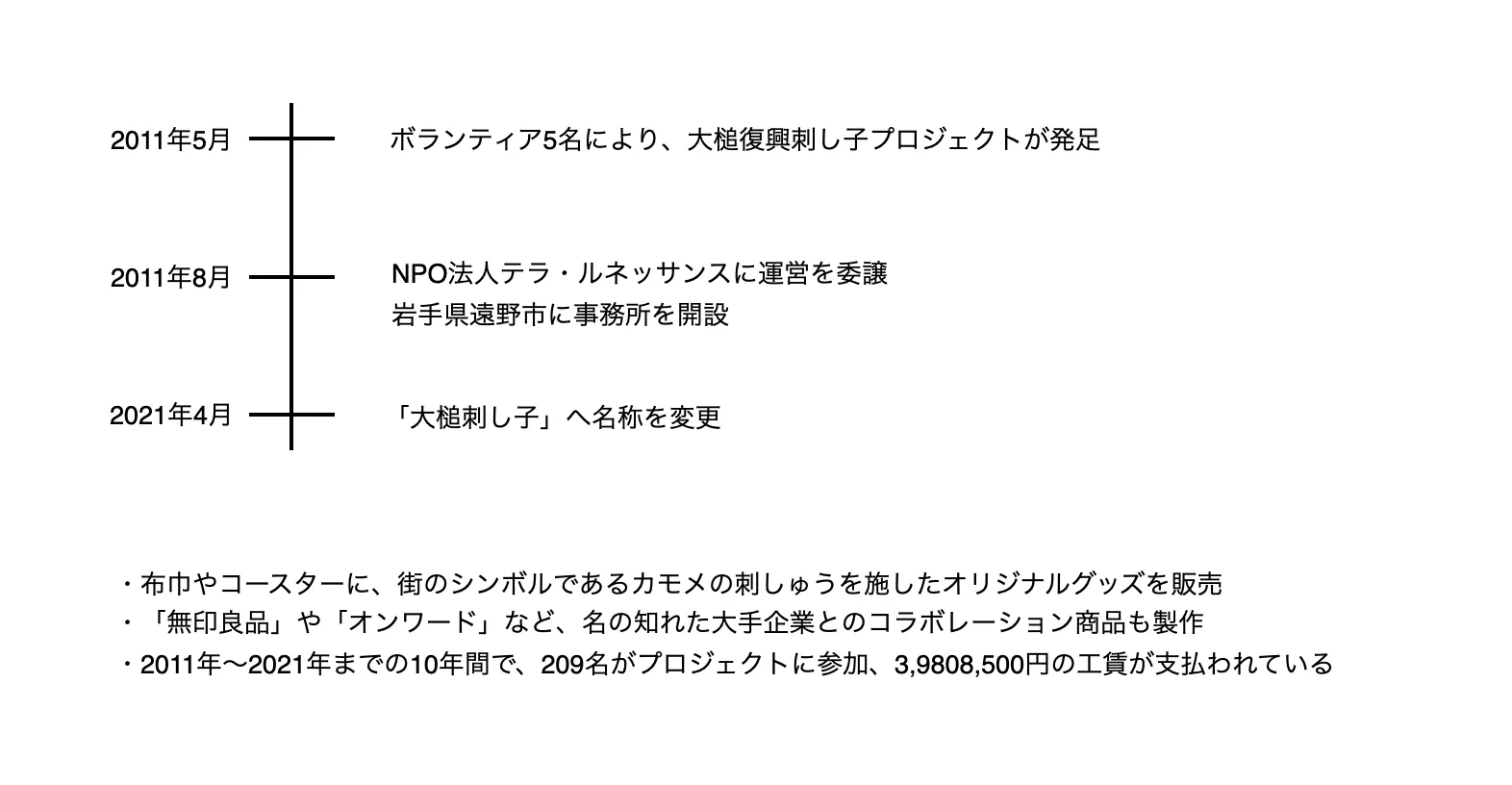 ボランティアではなく、ビジネスの力で継続的に力になりたい。と、南相馬市、南三陸町などのプロジェクトを経て、「大槌刺し子」に辿りつきました。