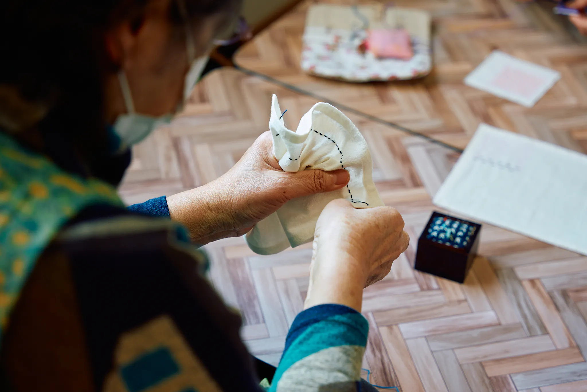 刺し子は針と糸さえあれば限られたスペースでできる仕事です。おばあちゃんも、お母さんも、働き盛りの女性も。これまでの日常では出会えなかった人たちが、膝を突き合わせて刺し子に勤しみました。
