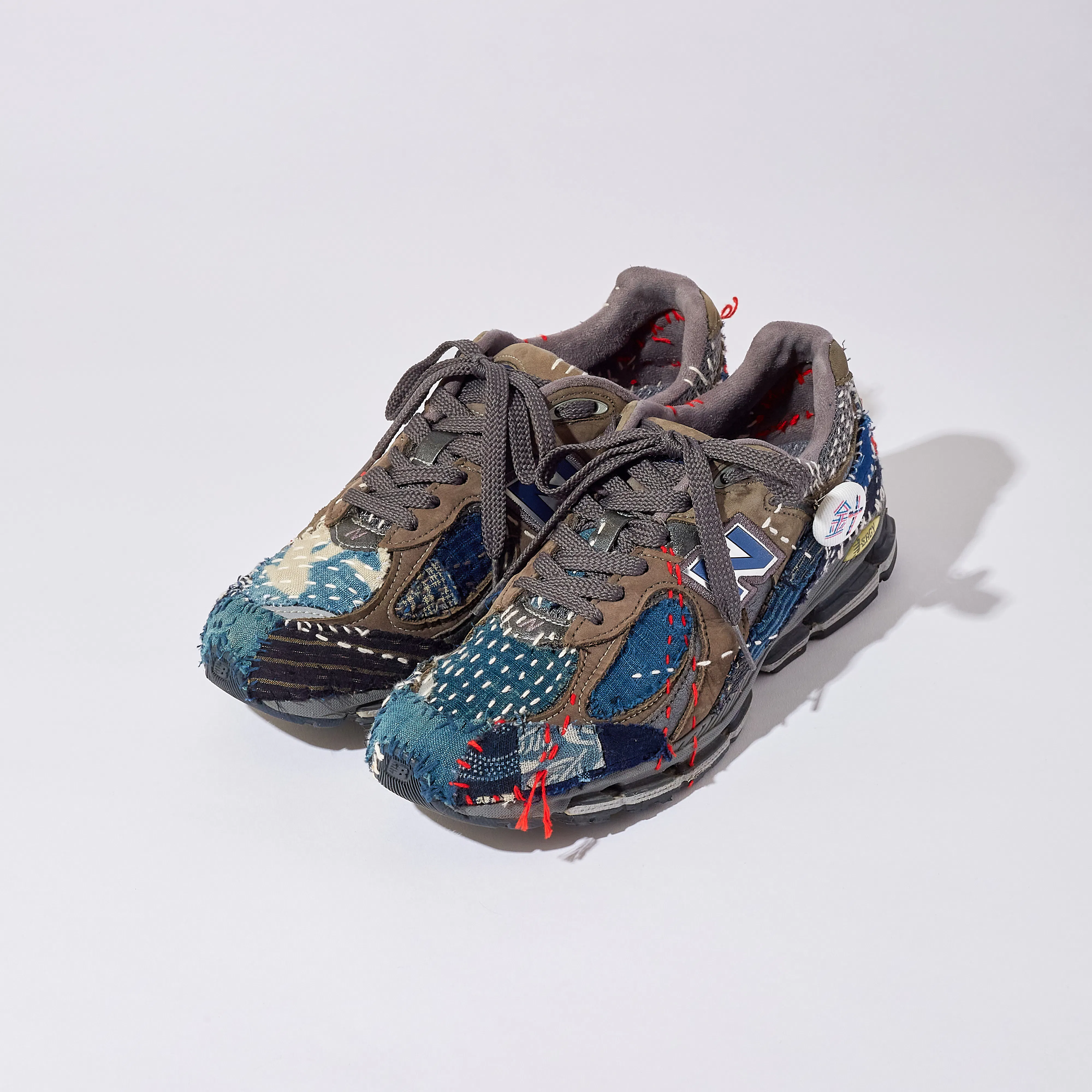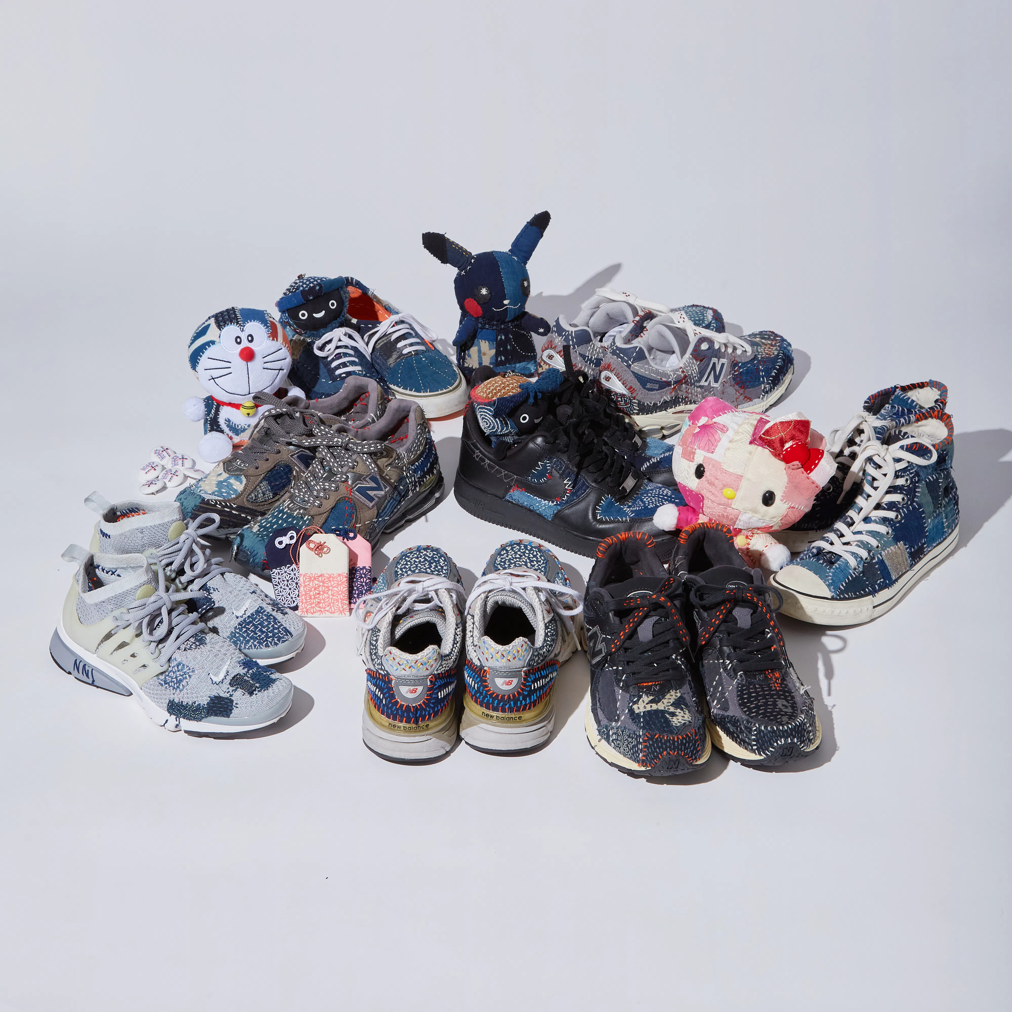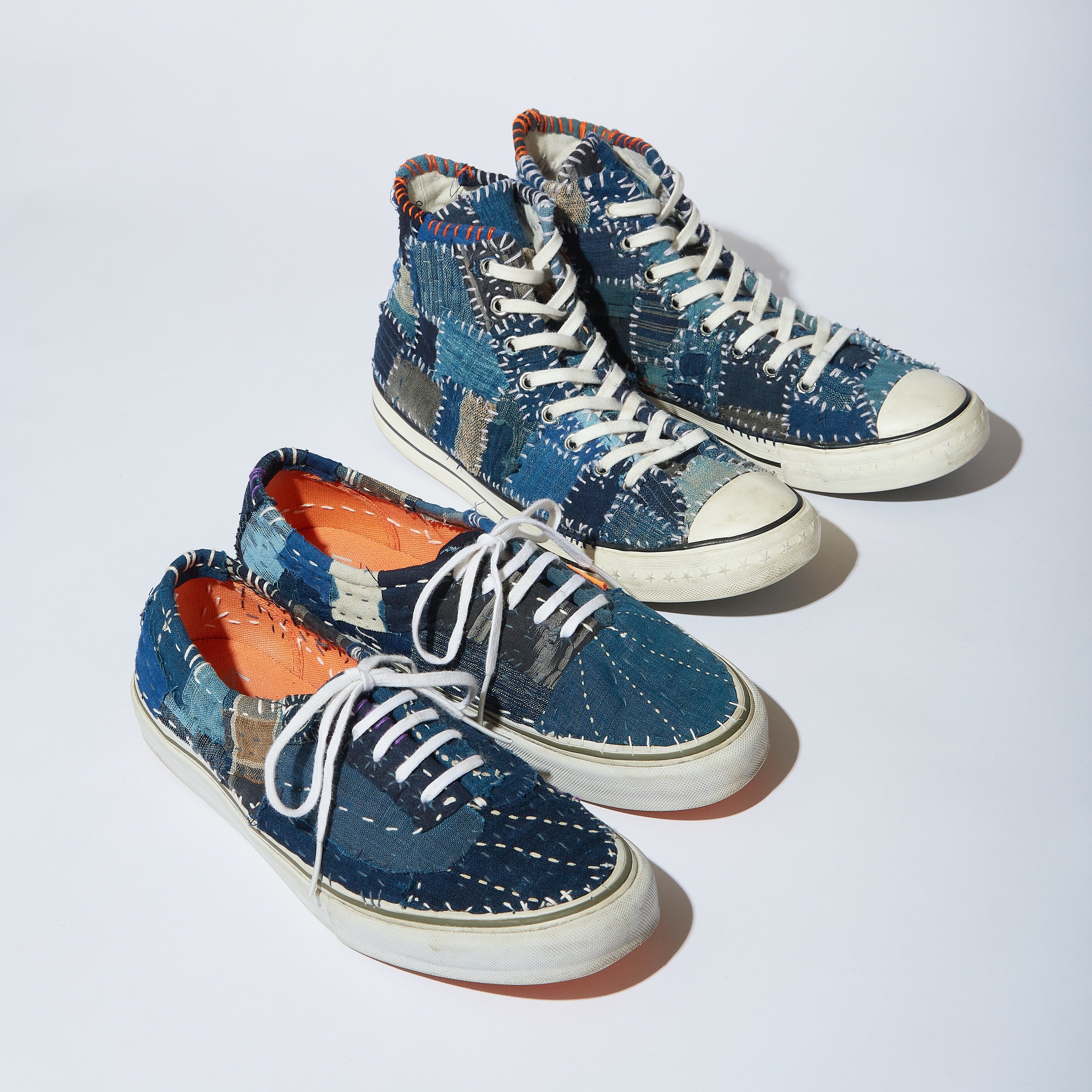 上の写真が出来上がりサンプルです。ちなみに、作業の効率化ができたと言っても、スニーカーの両足を仕上げるのに掛かる時間は15〜18時間! 大変な分だけ、刺し子さんがこのサービスにかける意気込みも激しく、一針一針心を込めてリメイクしています。