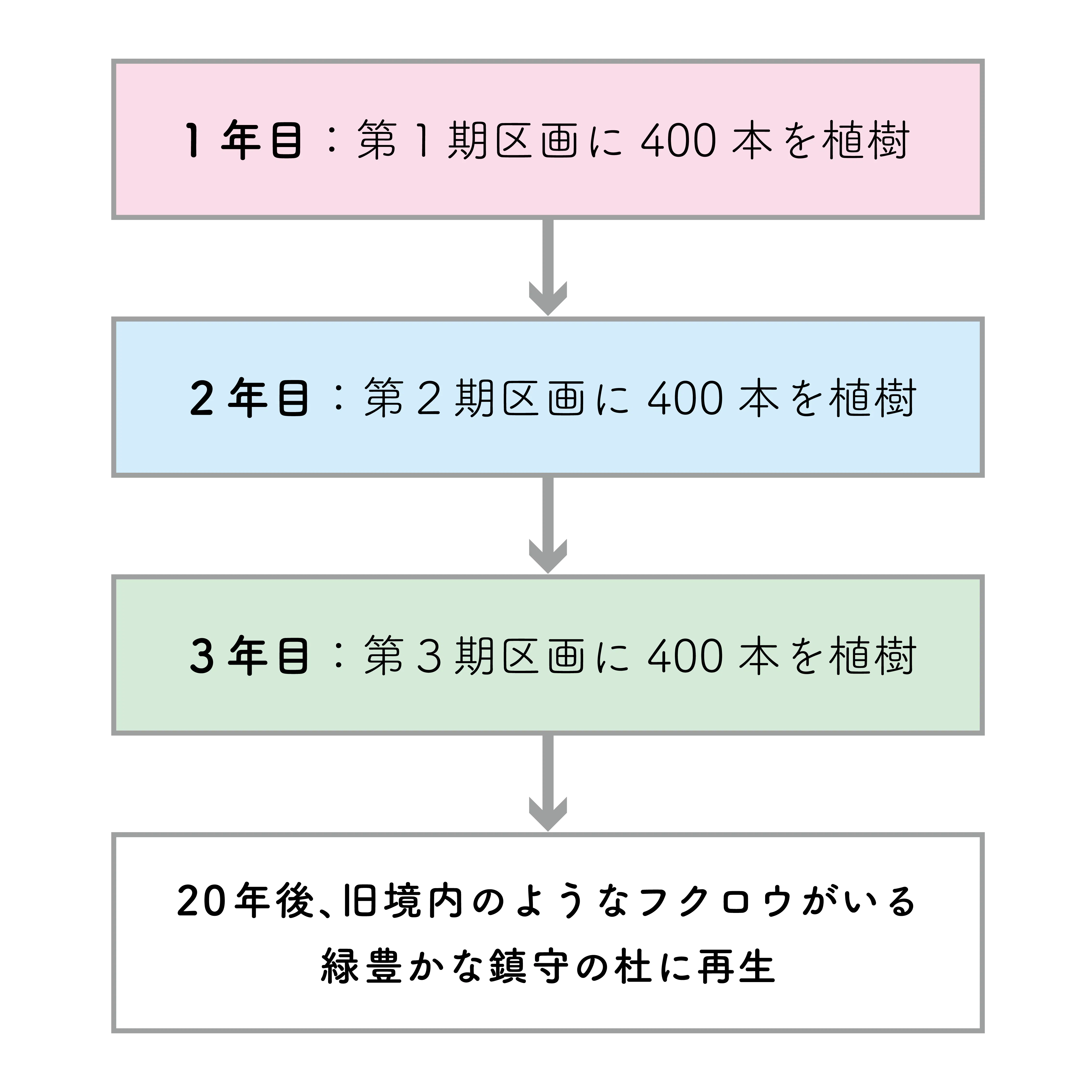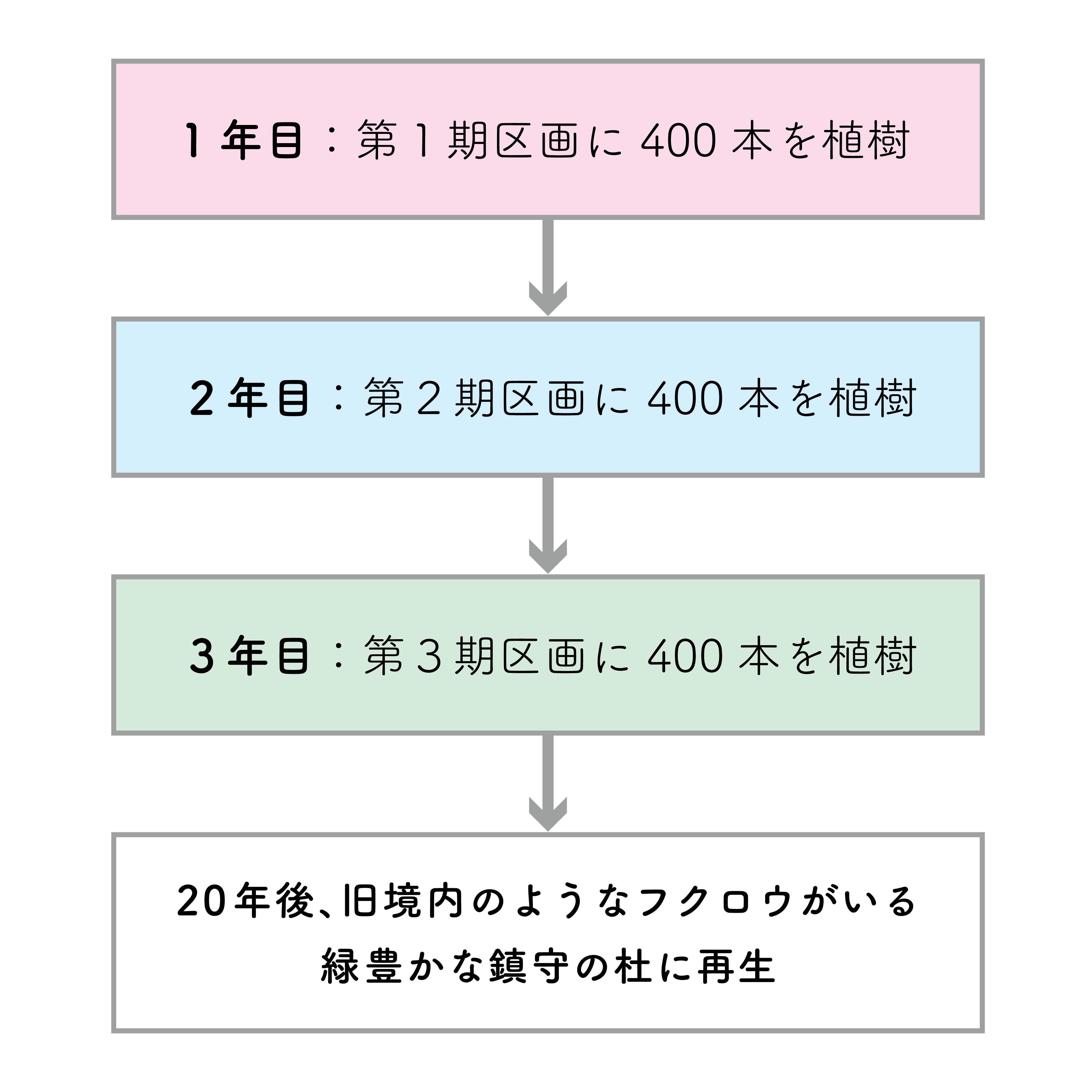 本プロジェクトの植樹は3カ年計画で進めていきます。具体的にはこれから千年続く「鎮守の杜」を作るために、植樹地を3つに区分し、その1区画ごとに400本ずつ木々を毎年植樹していきます。