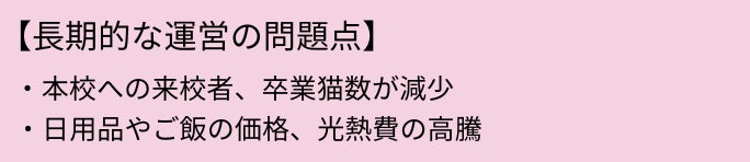 また、調子の悪い子などはその都度で動物病院に連れて行くので、医療費が上昇。スタッフの手も健康管理や通院にとられるようになり、SNSでの発信なども減り、卒業数や来校者数も減るという悪循環を生んでしまっております。