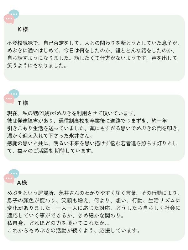 子どもたちからも、「めぶきの人たちが一番安心する」「めぶきがあって良かった」「ここに来て変わることができた」とうれしいメッセージをたくさんもらっています。