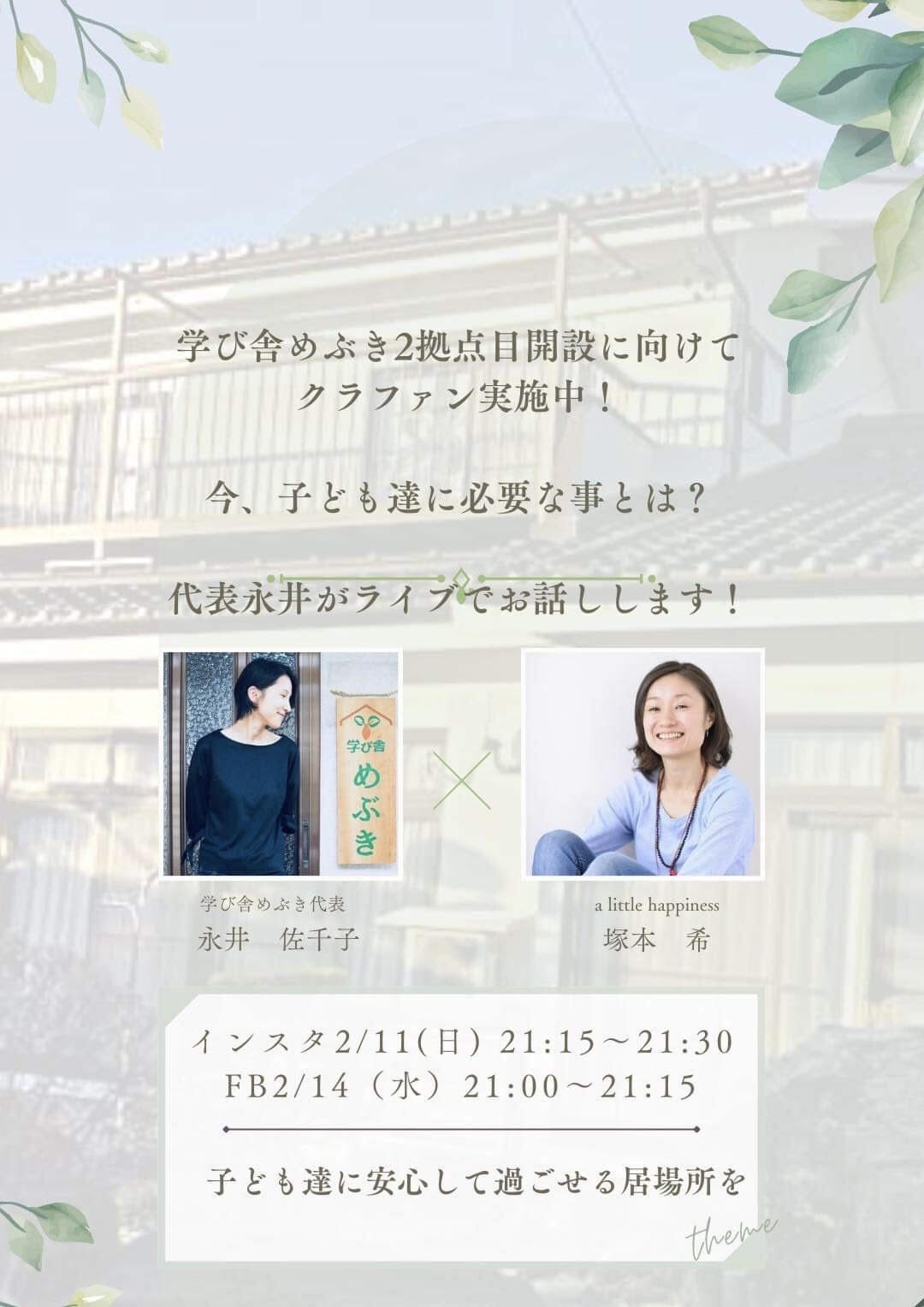 2024/02/11 14:16当活動を応援いただき、誠にありがとうございます!皆様の応援のおかげで、直接ご寄付いただいた方を合わせ、これまで60名を超える方にご支援いただきました。感謝の気持ちでいっぱいです。クラファン期間も残すところわずかとなってきましたが、最後まで動いていきたいと思います。これまでメルマガやSNS、チラシなどを通して拡散してきましたが、20年来の友人が、文字だけでなく音声でも伝えてみたらいいのでは?とこの度、インスタとFacebookでライブ配信を企画してくれました。初めてのライブで私もドキドキですが、一人でも多くの方に知っていただけるきっかけになったらなと思います。永井佐千子ってどんな人?めぶきってどんなところ?とご興味のある方が周りにいらっしゃいましたら、ぜひご案内いただけましたら嬉しいです!【LIVE 参加方法】2/11 21:15〜21:30@a_little_happinessのストーリズにお入り下さい。(@a_little_happinessをフォロー下さいますと上の丸いアイコンがぐるぐるするのでそこをタップして下さい)良かったらコメントも入れて下さいね!場が足りない、という声が本当にたくさん届きます。ないのであれば作るしかない。みんなで理想の場を作り上げていきたいと思います。引き続き応援をよろしくお願い致します!永井佐千子 もっと見る