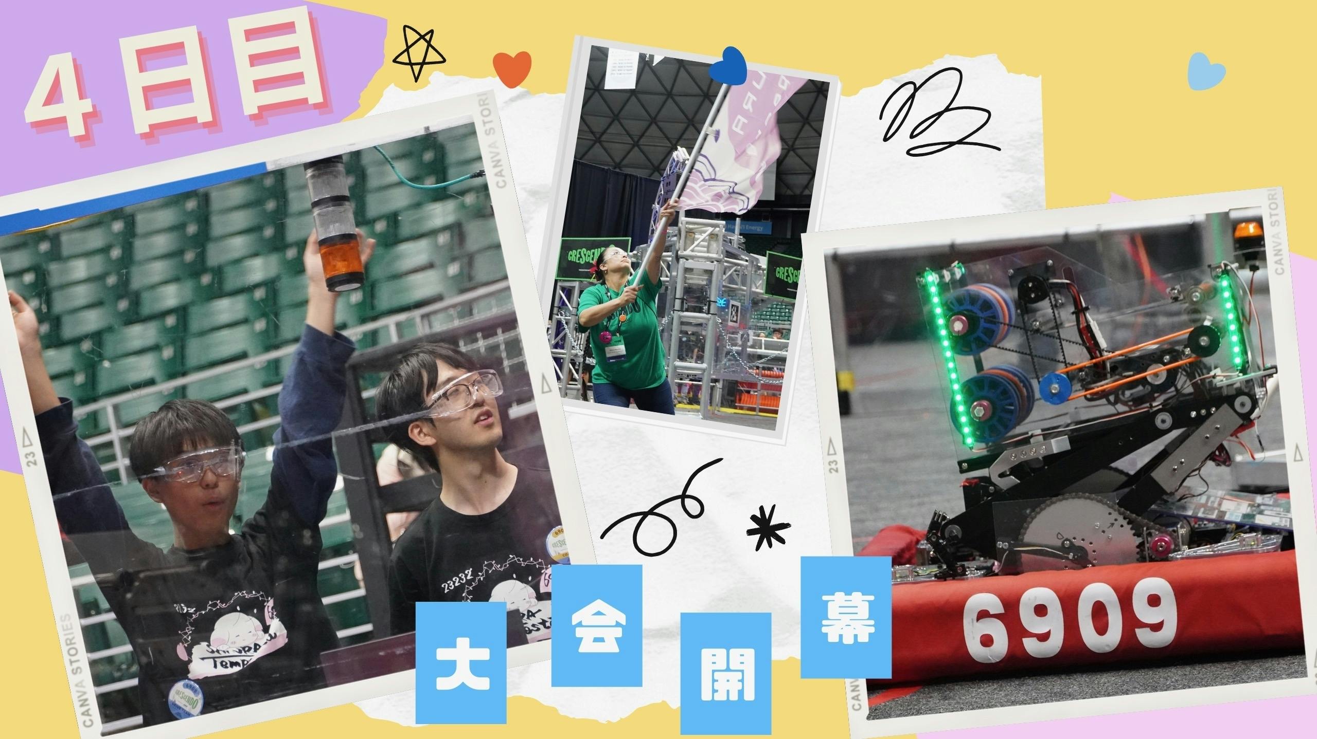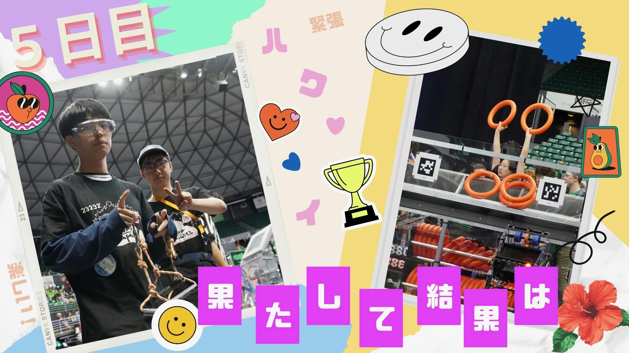 • プラクティスマッチが無事終了し、ついにハワイ滞在4日目に本番を迎えました!!FRCでは予選のことをQualificationと呼び、この成績に応じてランキングがつけられます。次の日のAlliance Selectionと呼ばれる決勝戦進出チームの選択で、ランキングは非常に大切になってきます!会場の雰囲気も昨日とは違い、大盛り上がり!この日ののサクテンの出場は合計9試合です!果たして結果は…まずは開会式!司会者によるAlohaコール(×5回くらい)や、審査員やスポンサーの紹介、国歌斉唱などが行われました!その後すぐに試合が開始されます!試合には、ロボットを操縦するDRIVERが2人、さらにDRIVERに指示を行うCOACH、緊急時のロボットトラブルに対応するTECHNICIAN、NOTEを輪投げのように投げ入れSpotlightを狙うHUMAN PLAYERが1人ずつフィールドに入り、ゲームを行います!→試合直前のメンバーの様子試合は3つのチームが1つのAllianceとなって協力して戦います。より多くのポイントを獲得したAllianceの3チームが勝利します。それぞれのロボットの得意分野や苦手な分野が異なるため、事前の打ち合わせが非常に大切になってきます。同じAllianceになるチームはランダムで決められるため、その場で素早く情報を交換する英語力も必要になってきます!チームの団結だけではなく、その時に仲間となった他のチームとの連携も必要なFRC。ただのロボット大会ではないのです。→同じAllianceのチームとの事前打ち合わせの様子!作戦を決めます。午前は合計3試合!結果は1勝2敗でした。しかし、自動制御に安定感が出てきました!最初の15秒間はドライバーが一切操作をしない自動制御状態で、その間にSPEAKERにNOTEを投げ入れたりします。他のチームの自動制御も工夫が積み込まれていて、個人的には最初の15秒間が試合の中で一番好きです!ルールの詳しい説明は、100日計画72日目の動画(約1分)をご覧ください↓https://youtube.com/shorts/On9hDwlov9A?si=a7XFNFlEtNJAFWUB午後は合計6試合です!午後の最初の試合である第4試合目で、今大会最大のピンチがサクテンに訪れてしまいました。なんと、第4試合目で今回のロボットのシューターとドライブベースを結びつけているリンクが外れてしまうというハプニング!メンバーは能力を結集させ、音桜(NEO)を治します。迫ってくる第5試合目、果たしてどうなるのでしょうか。リンク機構の詳しい説明は、100日計画40日目の動画(約1分)をご覧ください↓https://youtube.com/shorts/e9i1ZL6Kshw?si=U98WZ5PHlWJ0Lr7G→調整は絶えず行われます第4試合目でリンクが外れてしまった音桜(NEO)ですが、第5試合目で他のチームのロボットとぶつかり、さらに破壊が進行するという大惨事!次の試合まで約1時間。次の試合のために自分たちができるベストな準備をします!しかし、この曲がってしまったリンクを万力でボランティアスタッフの方が直してくれました〜本当に奇跡としか言えません。メンバー一同感謝しています。ありがとうございました!なんとリンクが直ったということもあり、第6試合目で18位に浮上しました!やったー!早くも本日ラストマッチ!第9試合目!試合の出だしは順調でしたが、最後は配線のトラブルで少しフリーズしてしまいました。しかし、メンバーの諦めない心と素晴らしい連携がチームを最終的に15位にしてくれました!→観戦中に司会者から投げ込まれたお菓子をゲット!運が良いですね〜この日の夜はFRC主催のパーティーがあり、沢山のチームが参加していました!主催者の方が「チームの異なる6人でチームを組んでご飯を食べましょう」と言ってくださったおかげで、私自身も海外のチームのお友達を作ることができました!最初は、チームを組むのに孤立してしまいましたが、積極的に英語を話して、最終的には6人のグループを作ることができました!最後はアメリカではよく流れる「Macarena」や「Cutton Eye Joe」などのパーティーソングが流れて、みんなでダンスをして楽しみました。たとえ振り付けを知らなかったとしても、周りのお友達が優しく教えてくれましたので、メンバーも楽しめたと思います。→異なるチームのメンバーと一緒に食事をしました明日はQualificationの残り3試合とAlliance Selectionが待っています!クライマックスを迎えるハワイ大会、次回もお楽しみに!! もっと見る