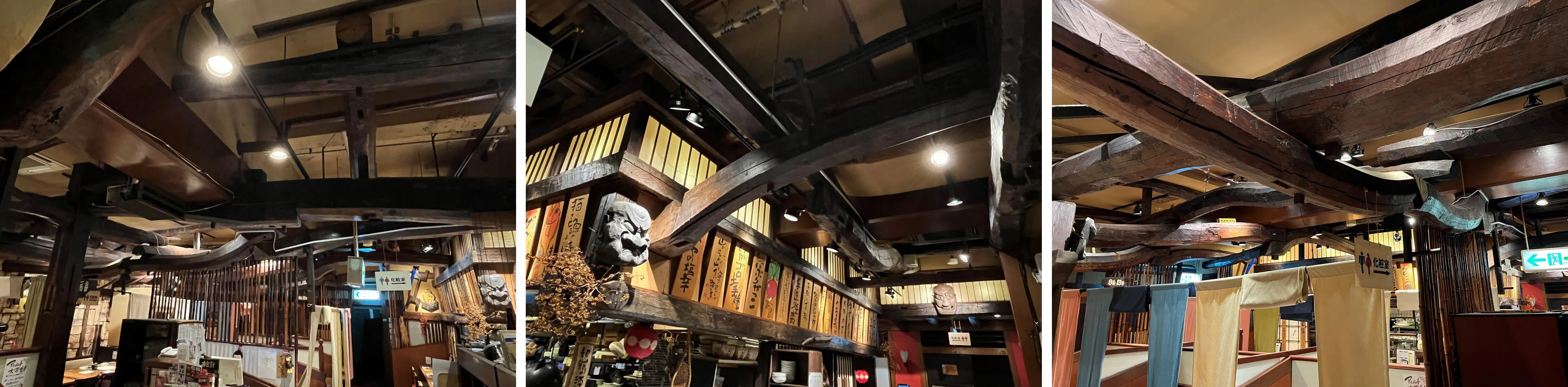 現在の店舗が出来たのは27年前ですが、10年以上かけて集めたという古材や骨董品などを内装に使用し、父が夢に描く店を形にしたものだったそうです。店内に入った瞬間に目を引く、天井に組み上げられた古民家の梁や柱、今なら宮大工さんでなければ再現できないと専門家にも言わせるクオリティです。カウンターの上に飾られている板看板メニューも今では珍しくないですが、字体も含めていちから看板屋さんと一緒に作ったものです。そのおかげで、実家に帰ったような安心感や郷愁感でついつい足が向くとお客様からも評価いただいております。それだけにコロナ禍の中でも、この店だけは何とか残そうと奮闘してまいりましたが、ビルの老朽化には勝てず、立ち退かなければならなくなってしまいました。