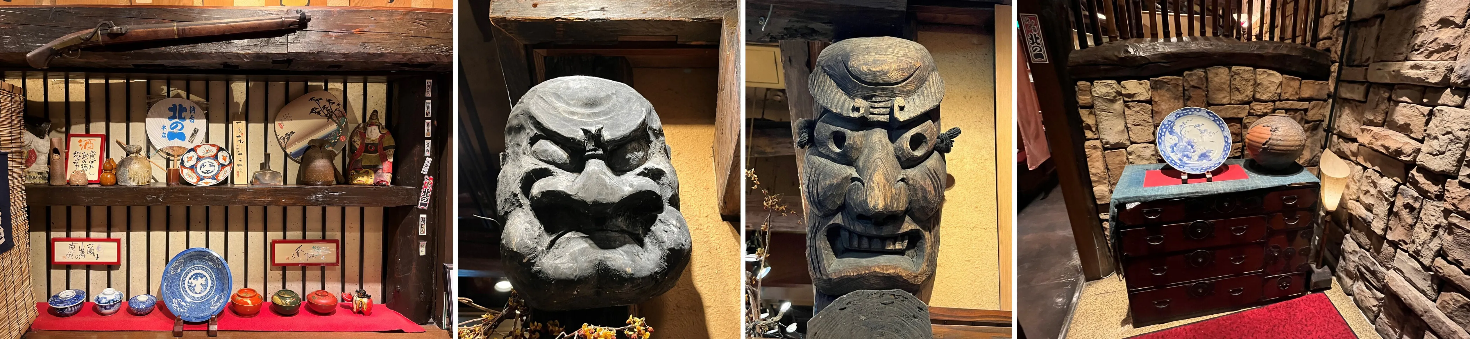 古物商の許可を取ってまで集めたという箪笥や器、お面(かまど神様)などの骨董品もたくさん飾られておりますが、古材たちのおかげでまったく違和感がありません。