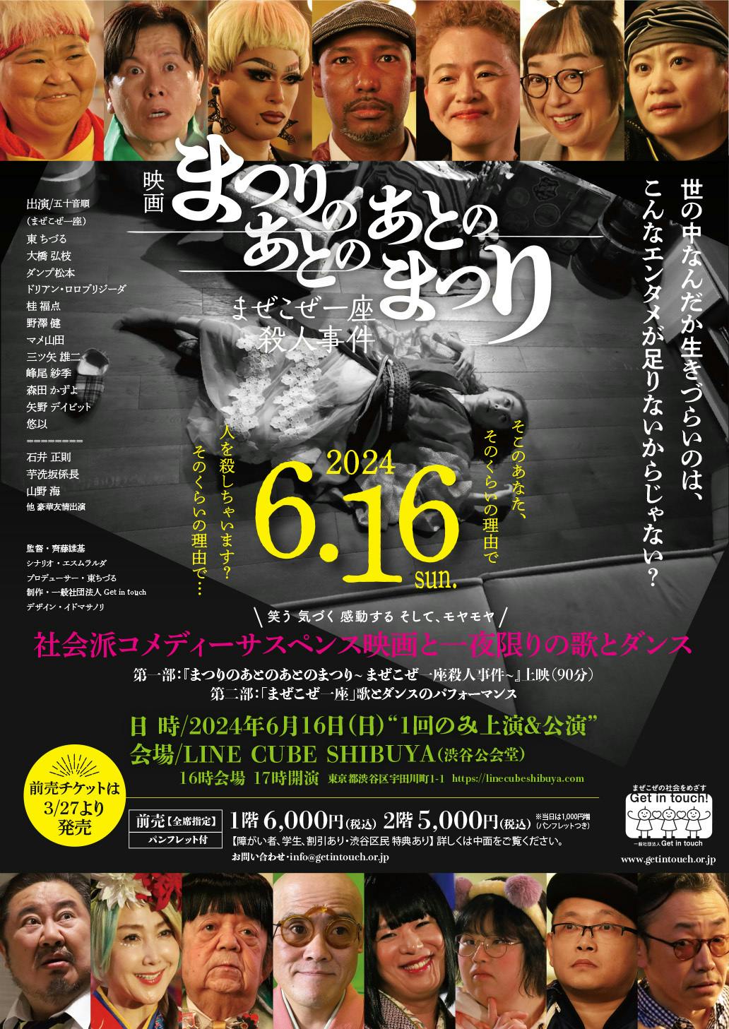 現在、Get in touchでは、マイノリティパフォーマーたちをキャストに起用した社会派コメディサスペンス映画『まつりのあとのあとのまつり~ まぜこぜ一座殺人事件~』を制作中です。まぜこぜ一座の舞台からはじまるとある事件をきっかけに物語が思わぬ方向に進んでいく、これまでにない新感覚のエンタメ作品です。Get in touchの活動に賛同した各ジャンルのプロが集結し、信念とスキルをすべてぶつけた、前代未聞の自信作です!この映画のエンドロールにあなたのお名前を載せませんか?