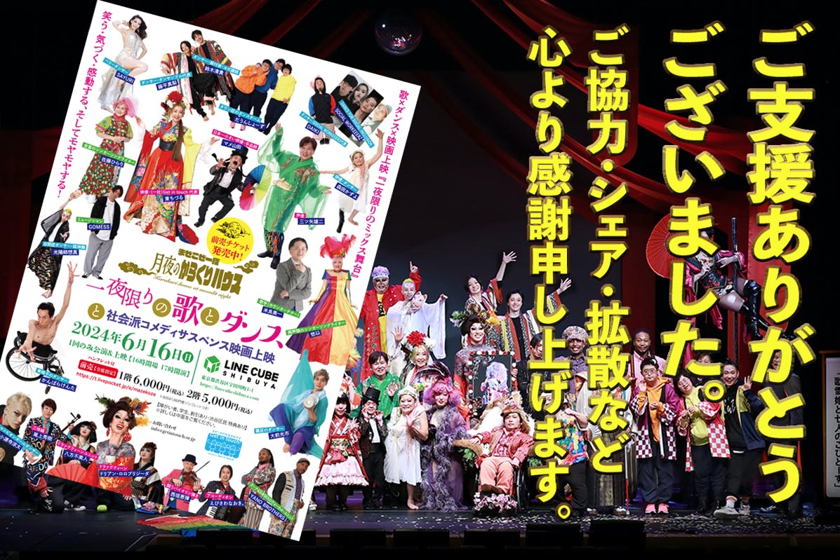 2024/05/17 17:49ご支援ありがとうございました。昨日をもちまして、クラウドファンディングが終了いたしました。242人のご支援と、目標額の342%達成という結果は、皆さまのご支援、拡散などのご協力のおかげです。メンバー一同、心より感謝申し上げます。本当にありがとうございました!私たちGet in touchのメンバーは、6月16日に主催します、歌とダンス公演 & 社会派コメディサスペンス映画上映 「まつりのあとのあとのまつり~まぜこぜ一座殺人事件~」に向かって準備をすすめております。◆チケット販売サイトはこちら→◆チケット買い方動画はこちら→これからも「まぜこぜの社会」 を目指し、私達はさらに気を引き締めて、諦めず、腐らず、邁進して参ります。引き続きの応援をお願い致します。ありがとうございました!! もっと見る