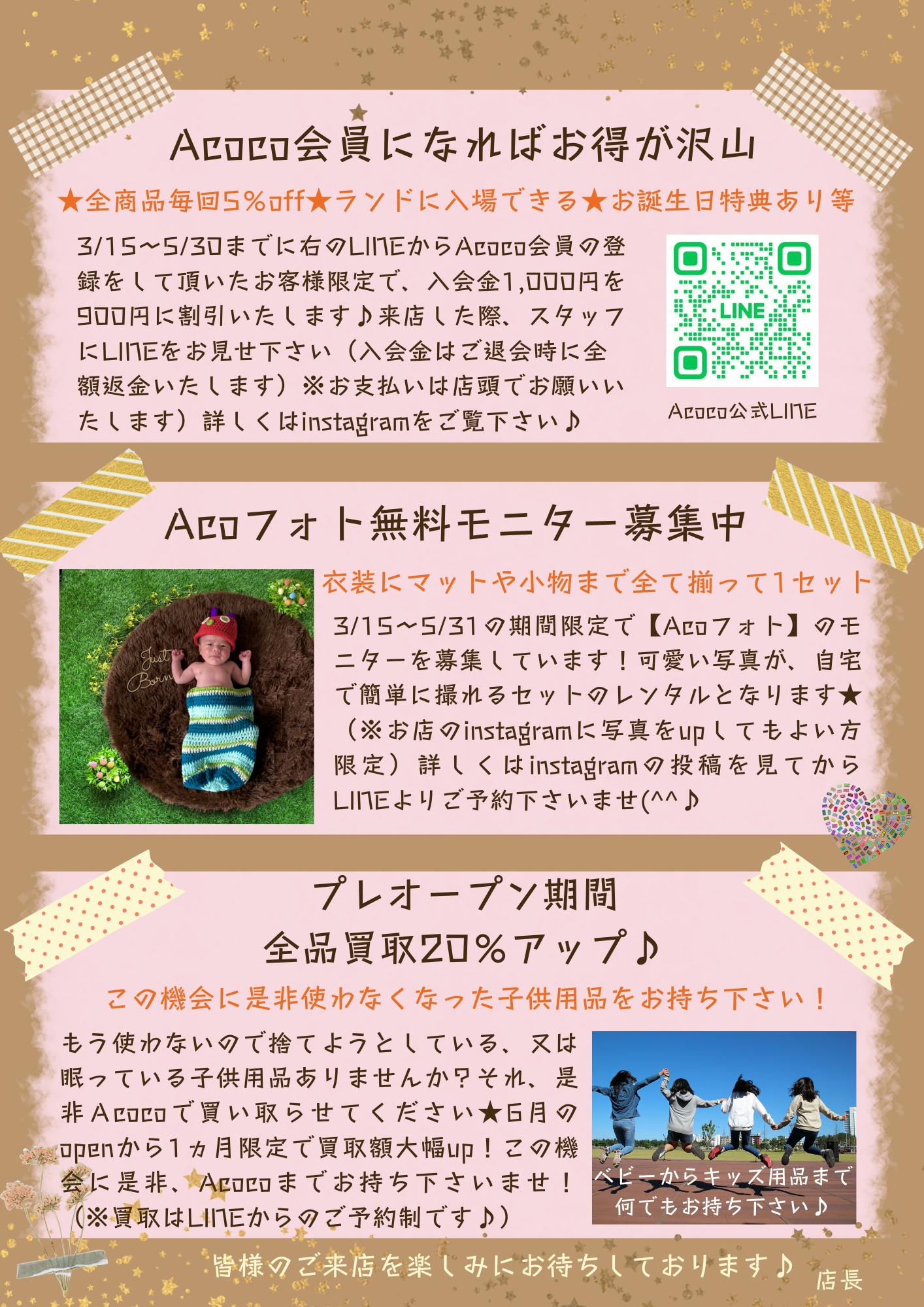 ③子供用品レンタル・・・ベビーベッドやバウンサー等、高額だけど使用期間は短く、使用後の保管場所に困るものは全てレンタルがオススメです。Acocoでは安くて綺麗なレンタル商品を取り揃えています。また冠婚葬祭衣装やコスプレ衣装、ベビーフォト用のグッズや衣装のレンタルも行う予定です。