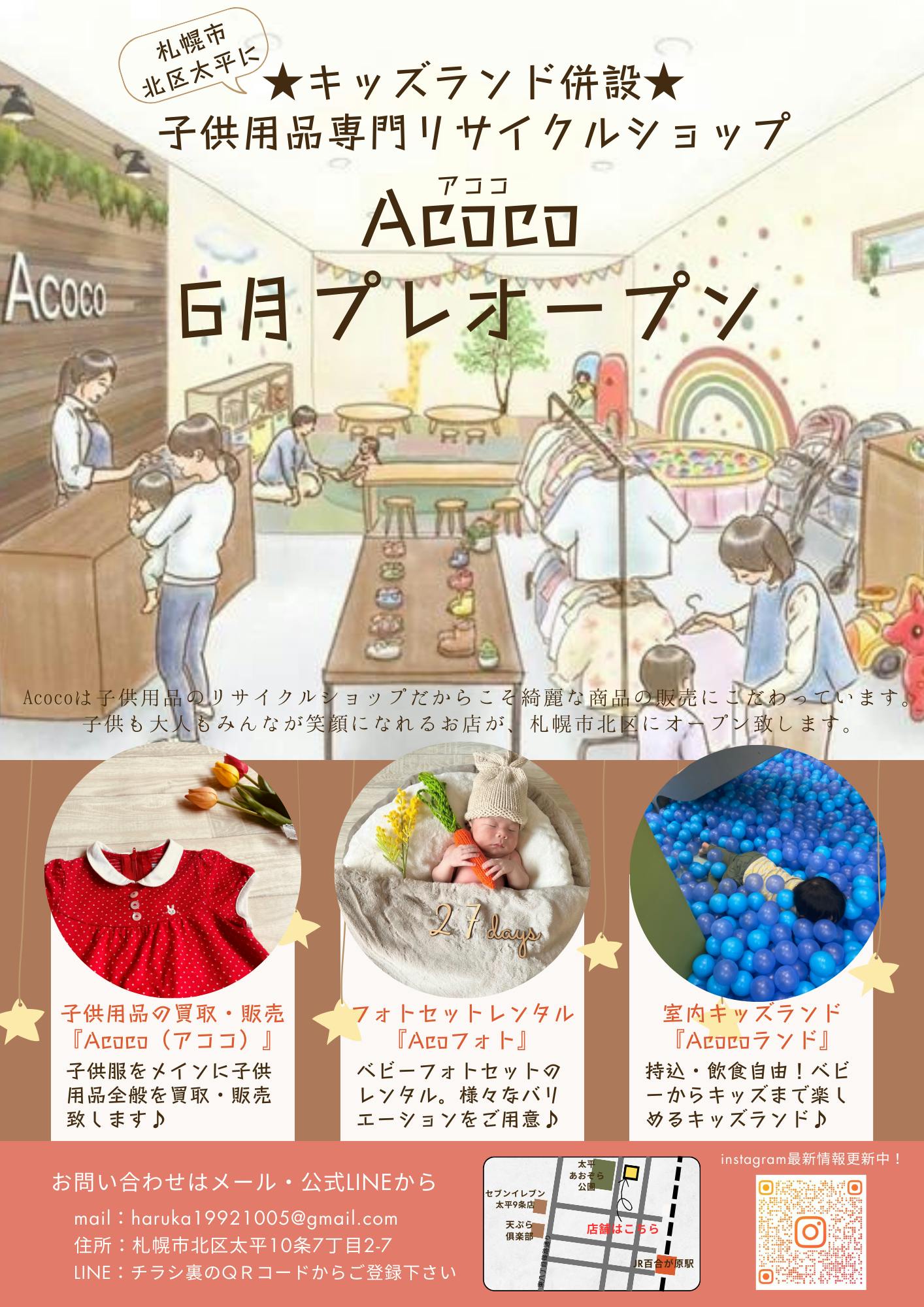 初めまして!私は生まれも育ちも北海道札幌市です。今年の3月末までは農業関係の会社で働いていましたが、3年前に第一子となる男の子を出産し、育児の大変さを身をもって体験した事で、同じように頑張っているママやパパを応援したいという想いが沸き、13年間勤めた大好きな会社を3月末で辞め、札幌でキッズランド併設の子供用品専門レンタル&リサイクルショップ『Acoco』のオープンを目指しています。