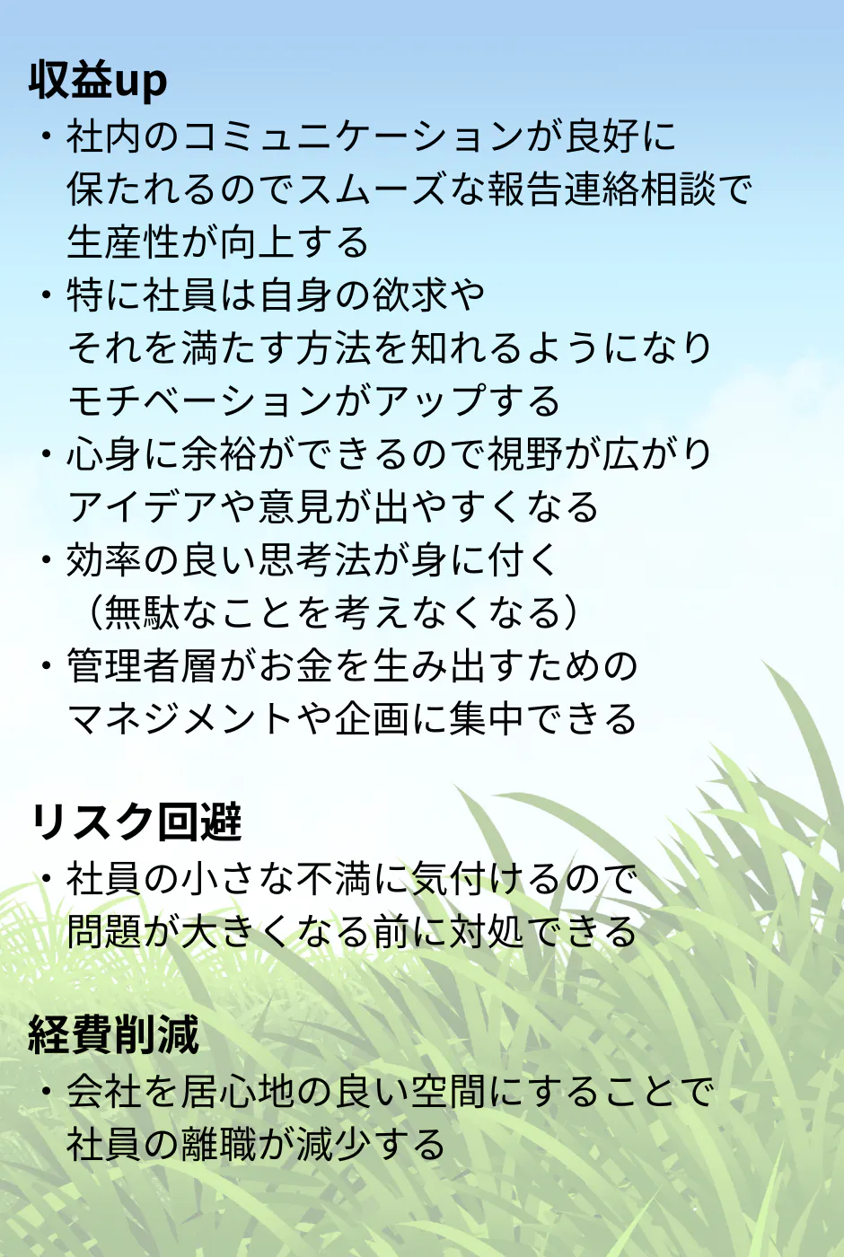 なぜならプロが社員と管理者のそれぞれを対象としてコーチングやカウンセリングのスキルを活用した対話を定期的に行えば企業は下記のような収益増加/経費削減/リスク回避の恩恵を受けられるからです。