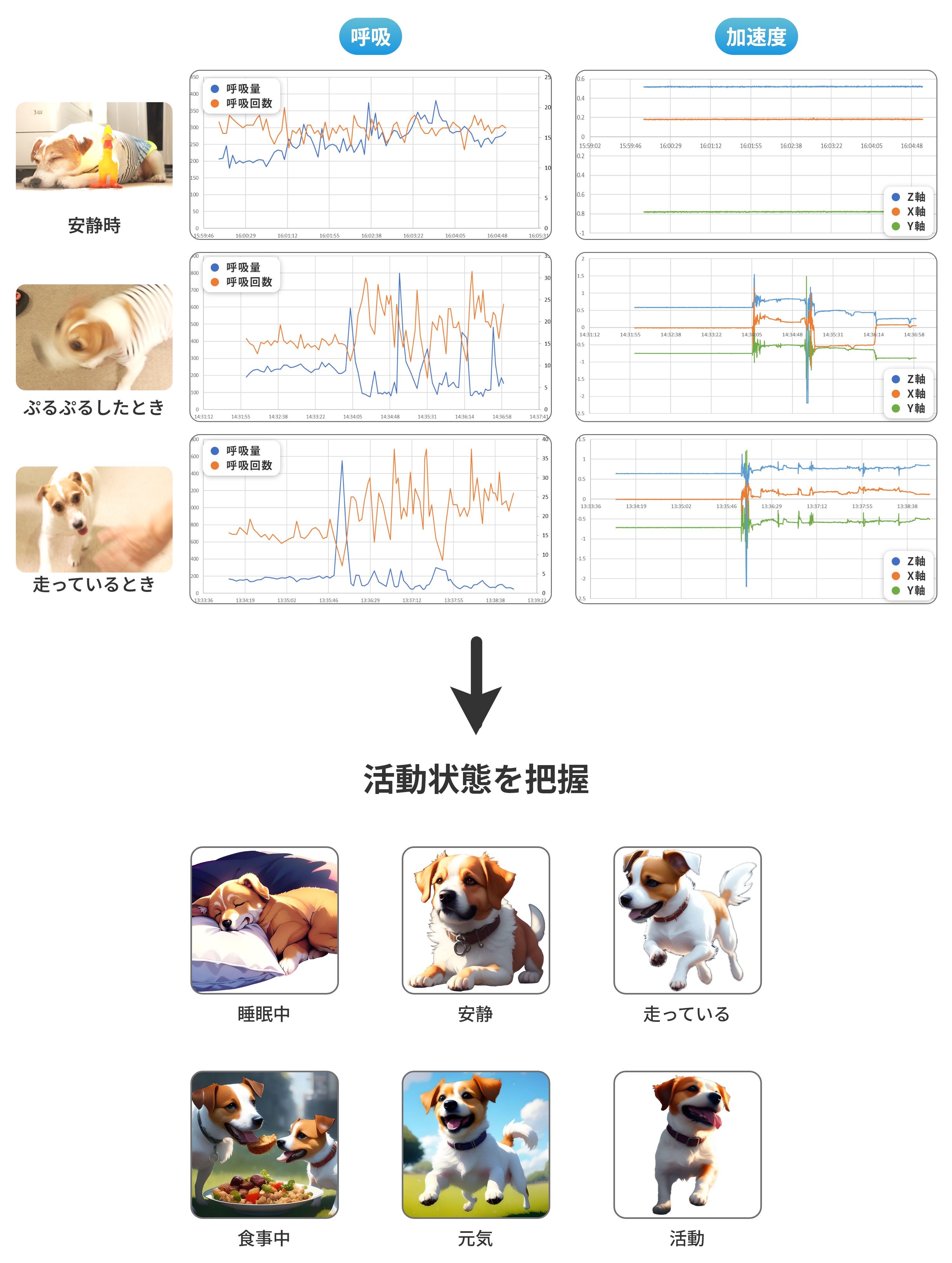 右の加速度の波形は、三軸加速度センサーのX、Y、Zの波形になります。3次元で動きを見ることができるので、愛犬のわずかな動きも検知します。