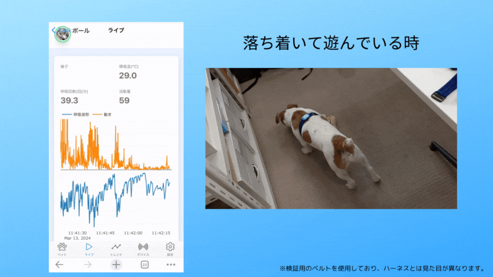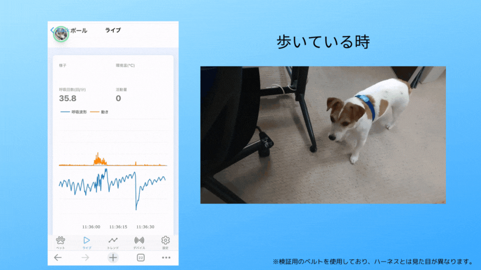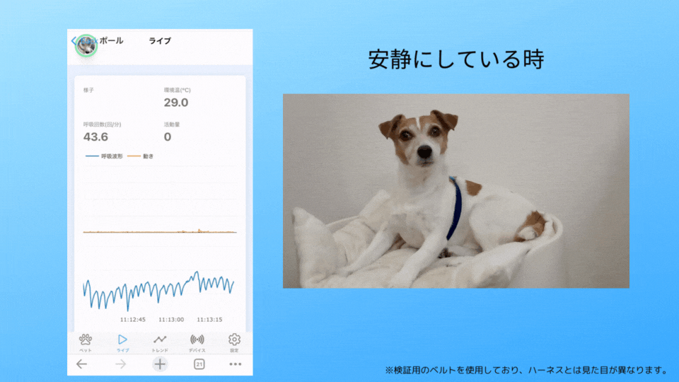 このハーネスを装着すると、ペットの【呼吸】と【動き】のデータを常時取得します。