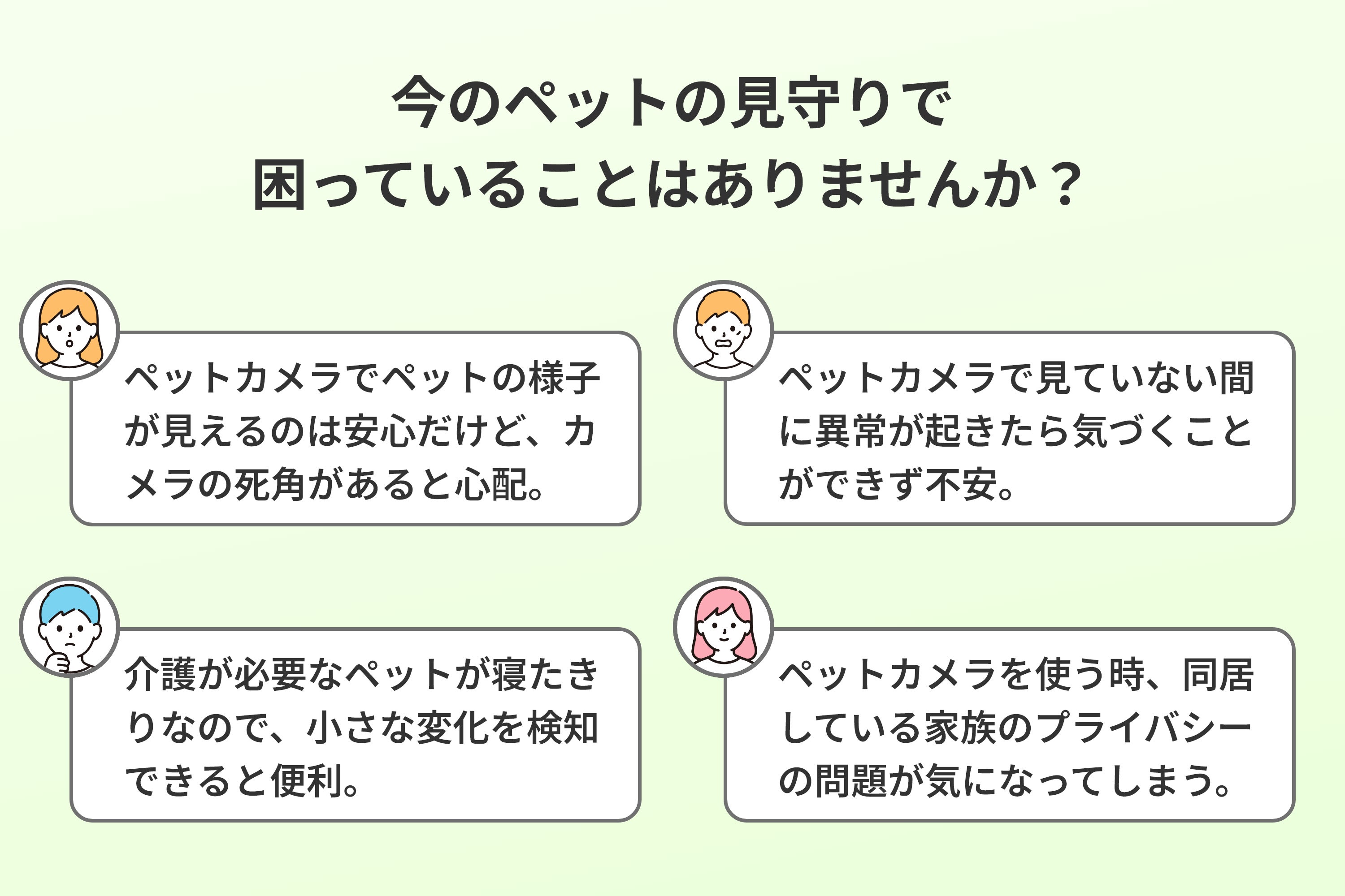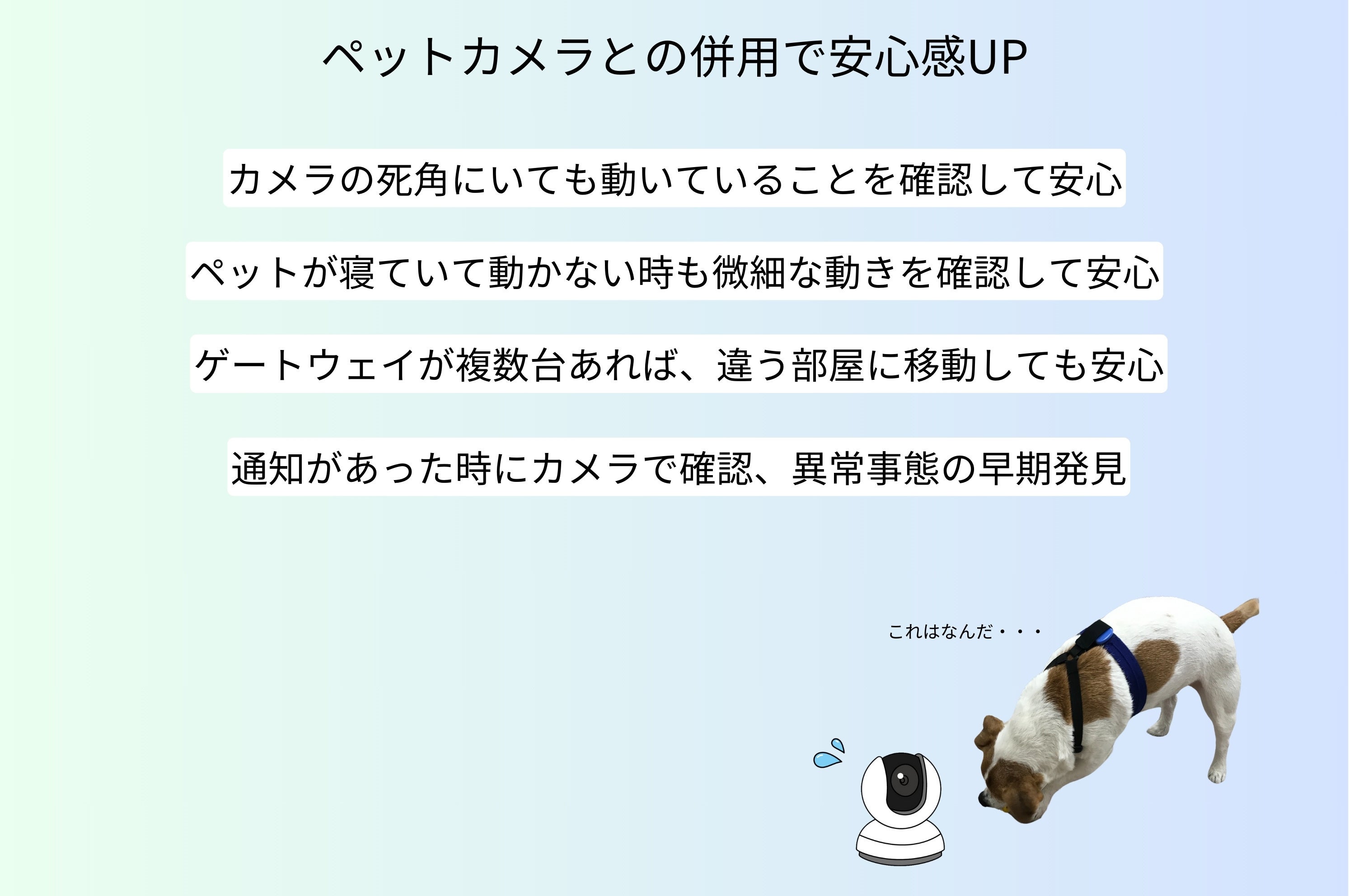 たとえば、部屋が広かったり、物が多かったりして部屋に死角が多い場合、複数の犬を飼っていて、カメラに入りきらない場合、同居人がおり、カメラで覗くのは好まれない場合などです。