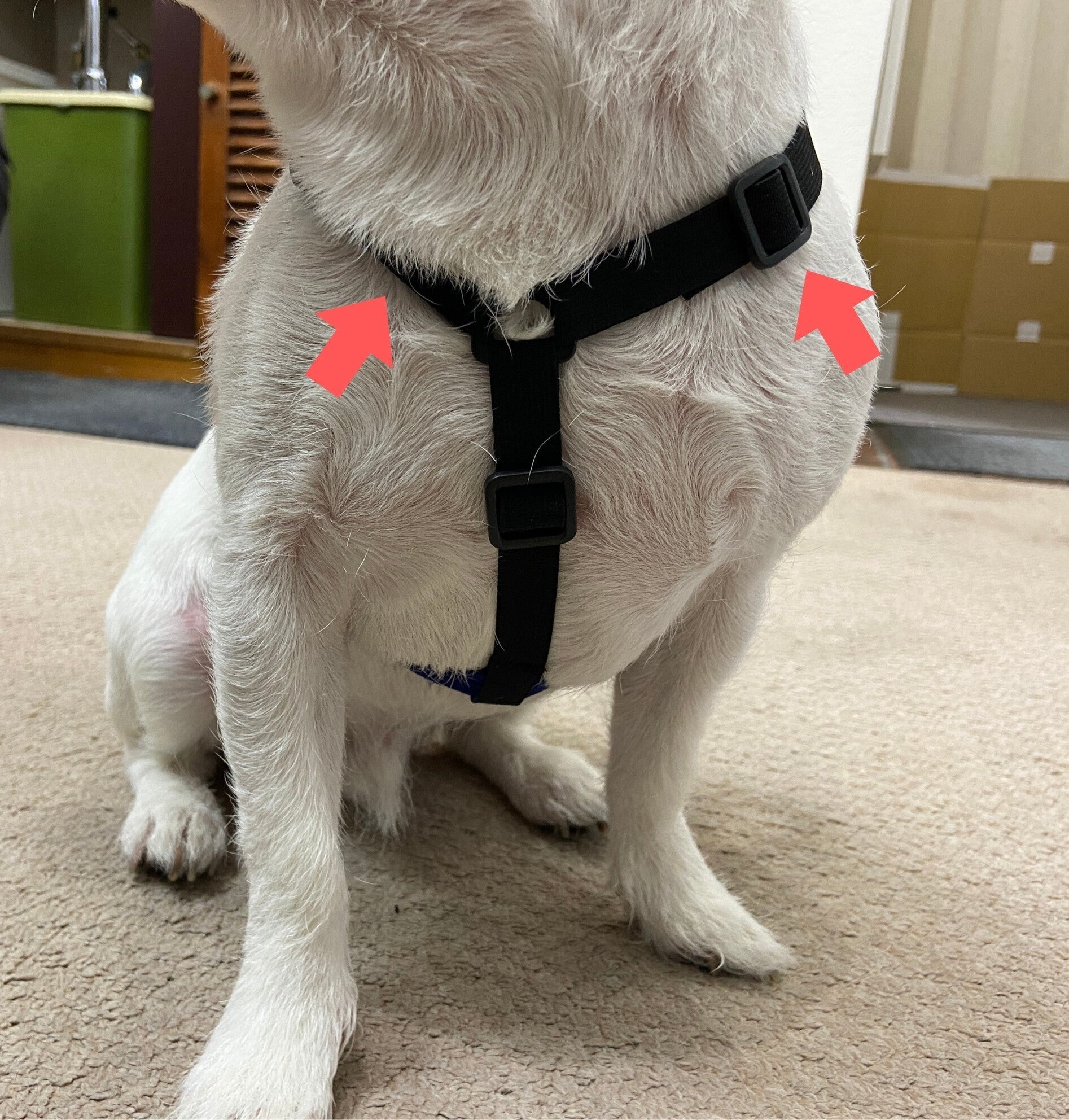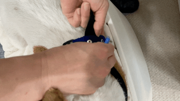 ハーネスを付けているとハーネスが嫌で動かなくなってしまう子もおり、センサー以外のベルト部分を極力締め付け感のないものに改良しました。