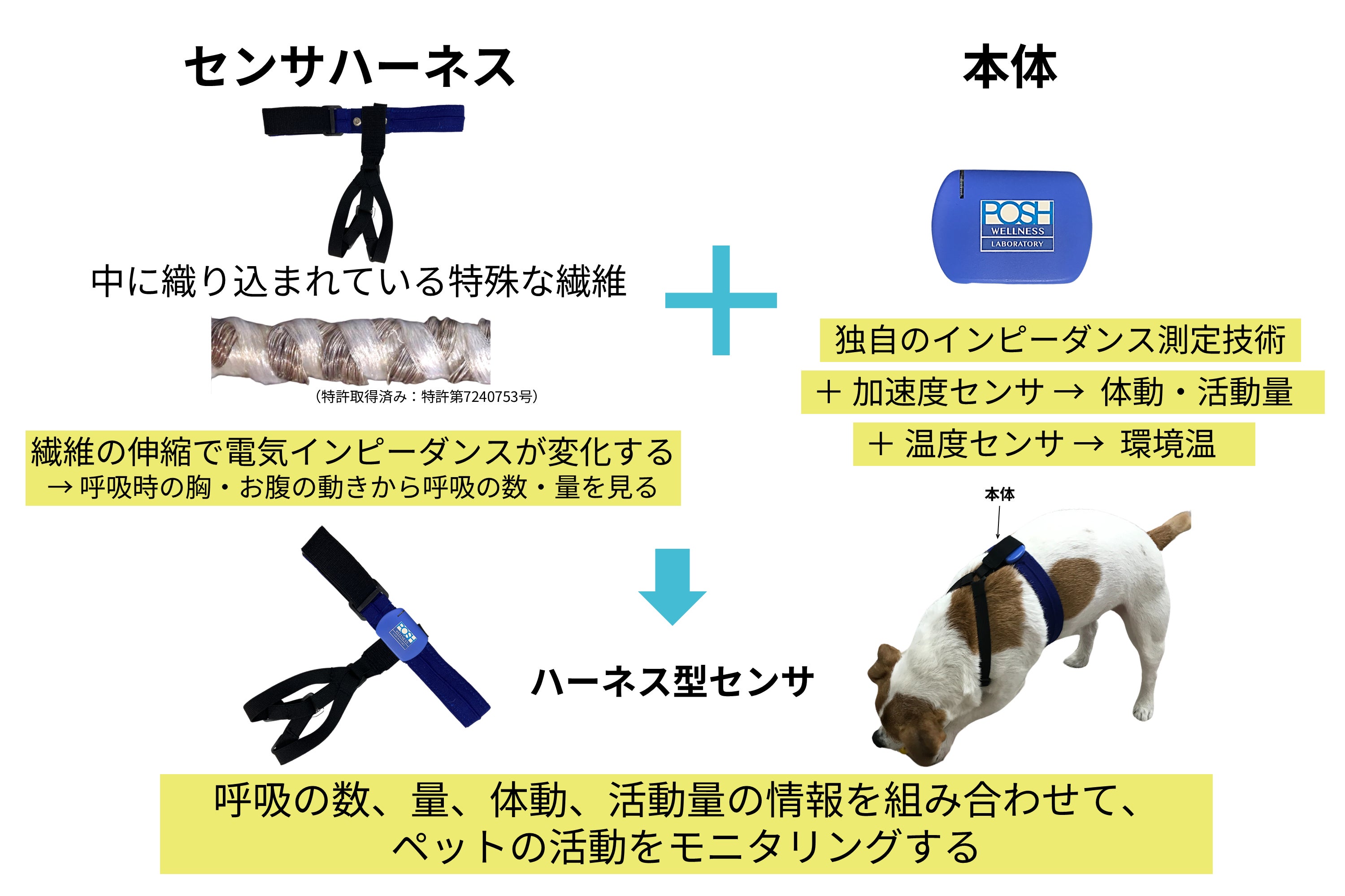 ウェルネー・ペットのハーネスには伸び縮みにより電気インピーダンスが変化する特殊な繊維が織り込まれています。 ※特許取得済み:特許第7240753号