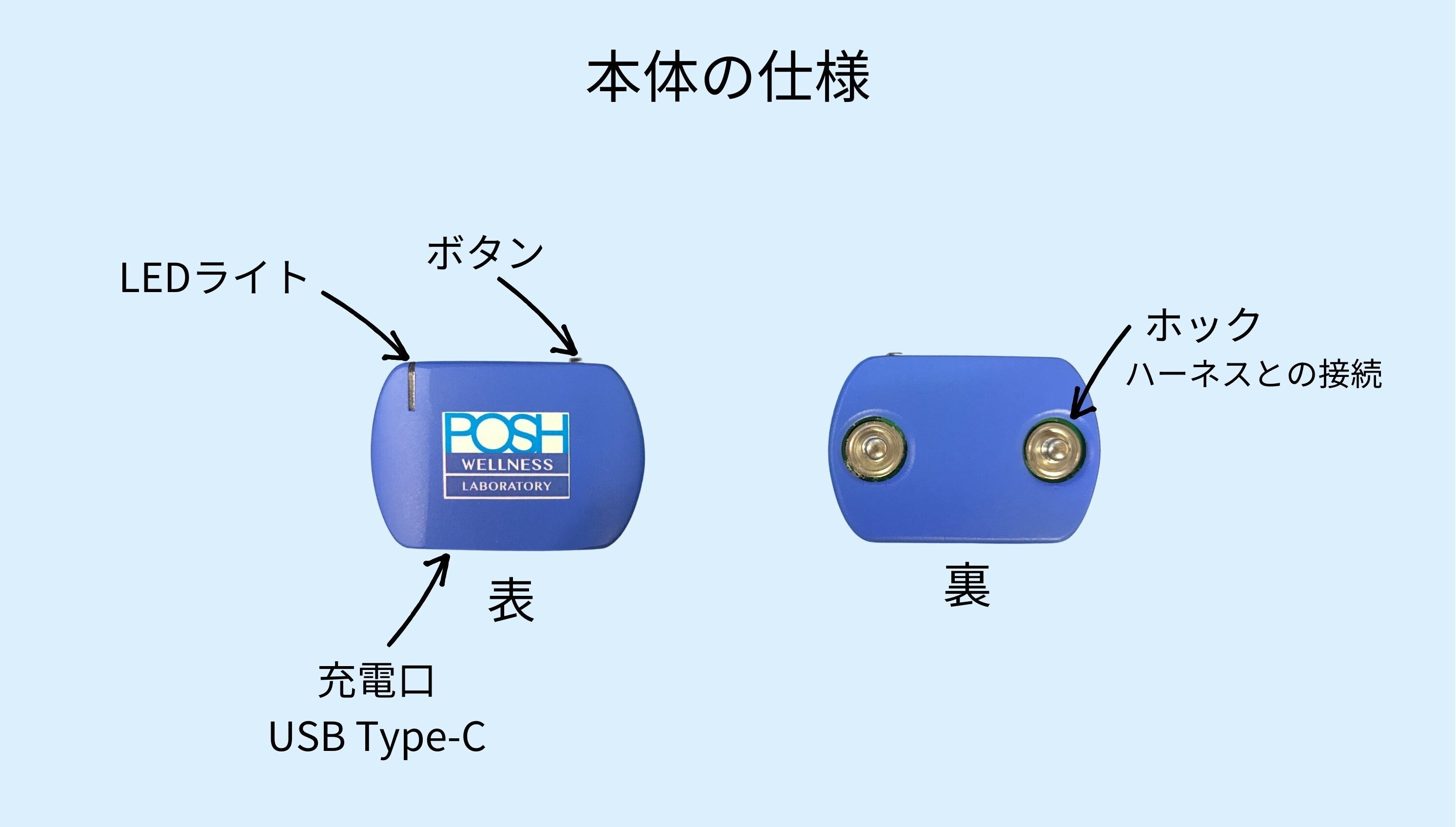 本体の充電はUSB Type-Cを使用。ハーネスとの接続はホックを使用します。二つのホックを付けることで自動でモニタリングが開始します。