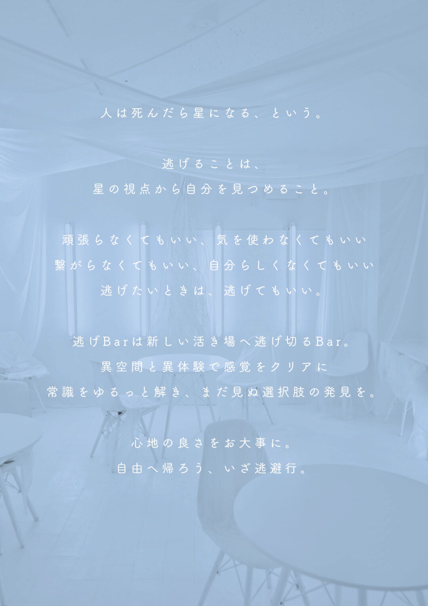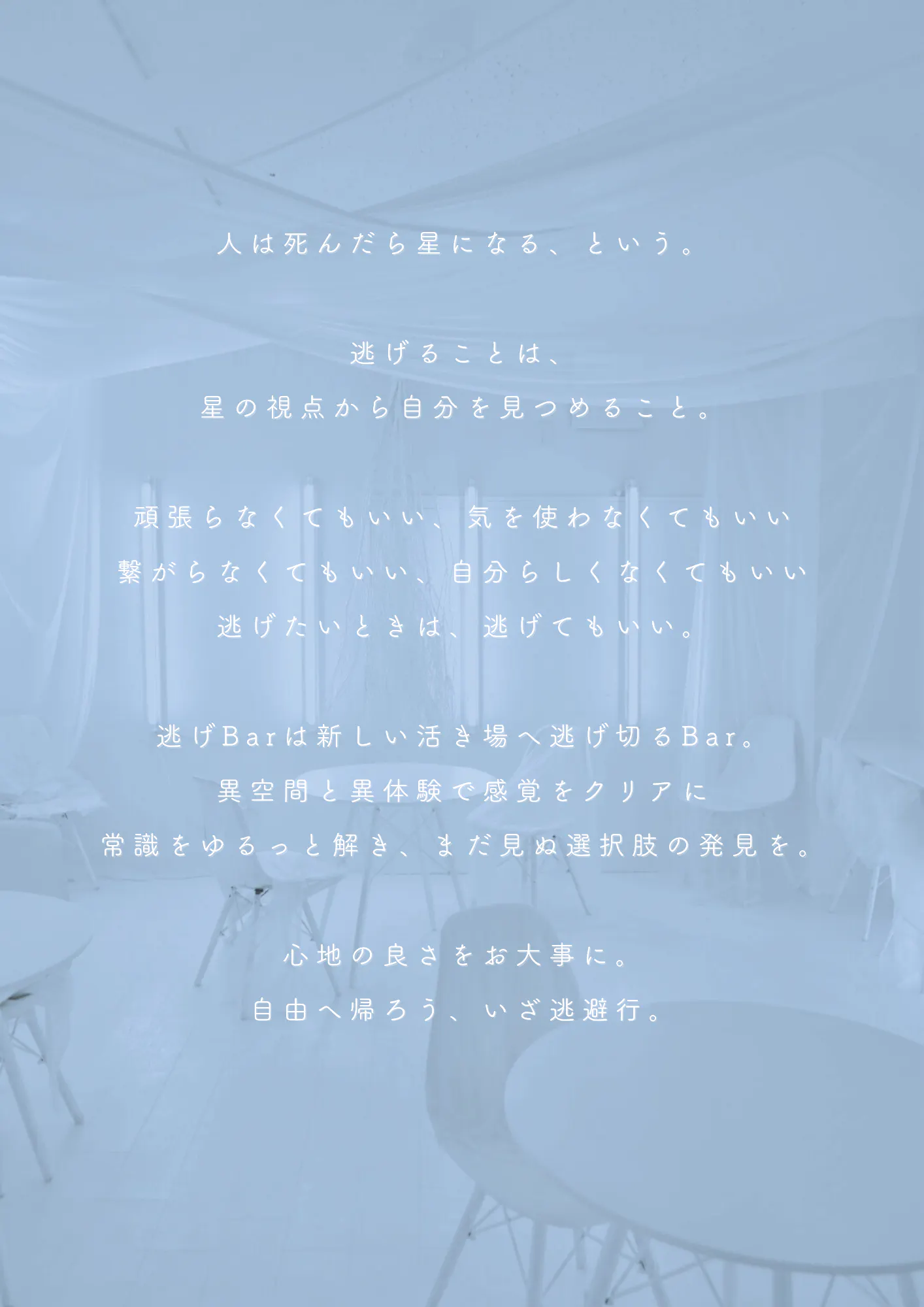 逃げBarは自らの存在をもって、社会に逃げのグラデーションをつくり、逃げるという選択肢を当たり前に選ぶことができる社会を志向しています。