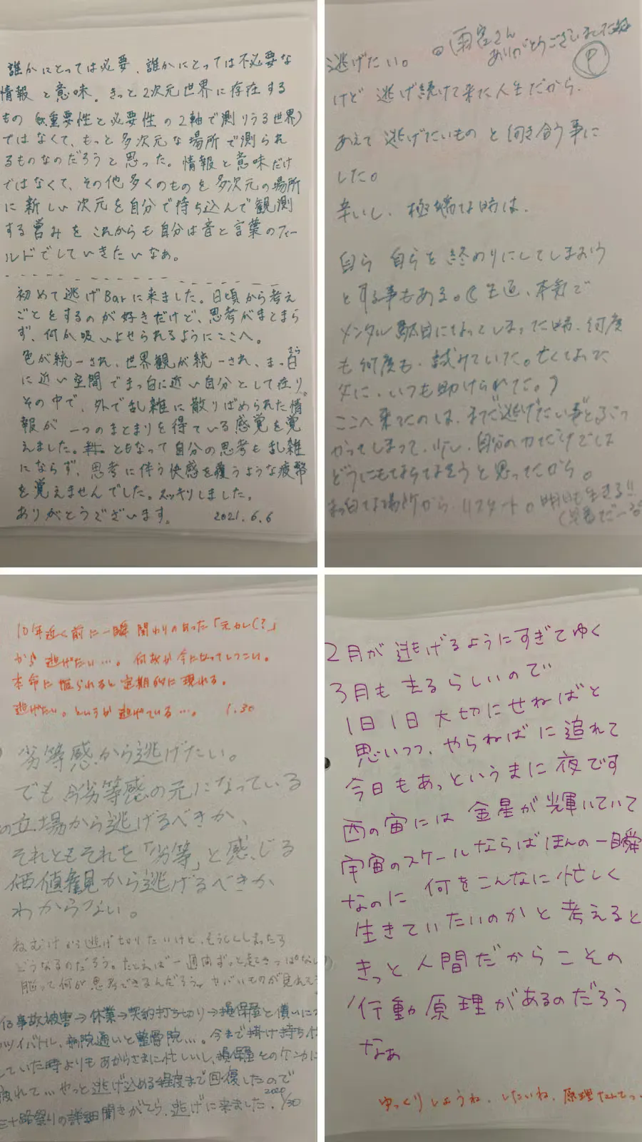 昨年も逃げBarを開き続けてきたなかで、あるお客さんは逃避行換日記をじっくり読みながら「Twitterとかだと真実味がなくて、リアルな字を見ると泣ける」と言っていました。あるお客さんは「逃げBarのTwitterで今日逃げられますと投稿があるだけで、安心して会社に行ける」と言っていました。