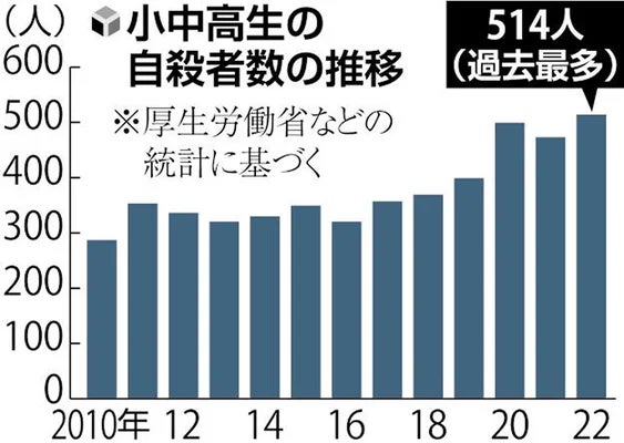 22年の自殺者数は前年比874人(4・2%)増の2万1881人で、2年ぶりに増加しました。男性が13年ぶりに増加へ転じ、女性も3年連続で増え、小中高生の自殺は514人で過去最多となりました。