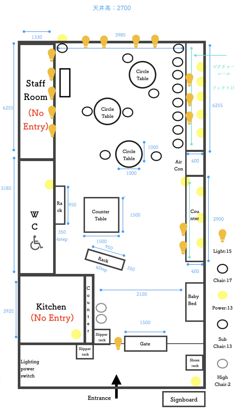 (店内図面です。76㎠あり、スタンディング50名ほどのキャパです)