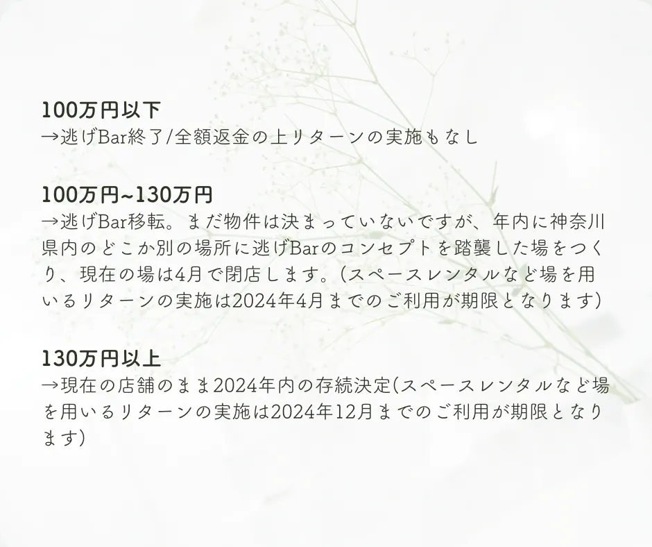 2025年 ~3月31日 : 来年3月末まで店舗の存続が決定し、店舗をご利用いただくリターンのご利用期限が2024年12月31日までとなります。