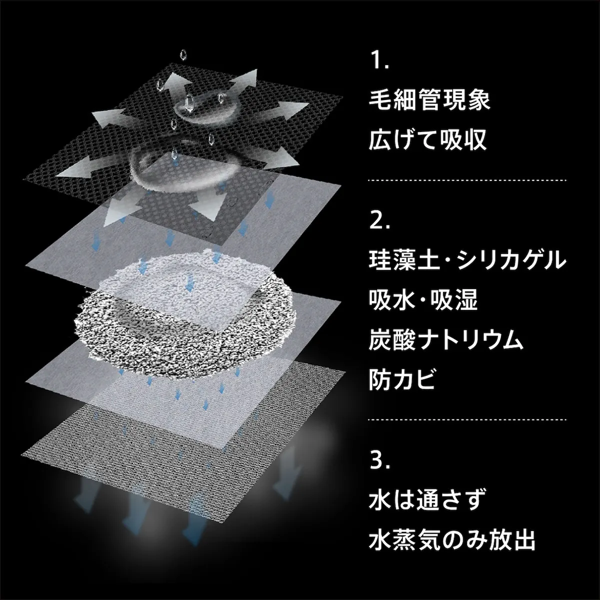また、透水するが含水しない性質の不織布を使っているので、効率的に珪藻土混合素材へ水分を移動させることができます。薄く平らにすることで表面積が広がるため、吸水力もアップ。