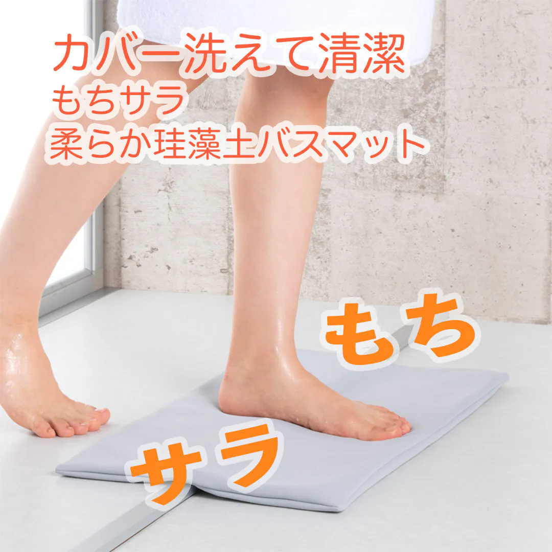 カバー : 約3秒で簡単に取り外せます。汚れが気になったら、手軽に洗濯でき衛生的。洗濯の際、一般的には洗濯物の重さの10倍以上の水が必要と言われていますが、「もちサラ」はバスマット全体ではなく、カバーだけを洗濯すれば良いため軽く、節水につながります。薄手で他の洗濯物と一緒に洗えるので、さらに経済的。洗濯槽や干す時にもかさばりません。
