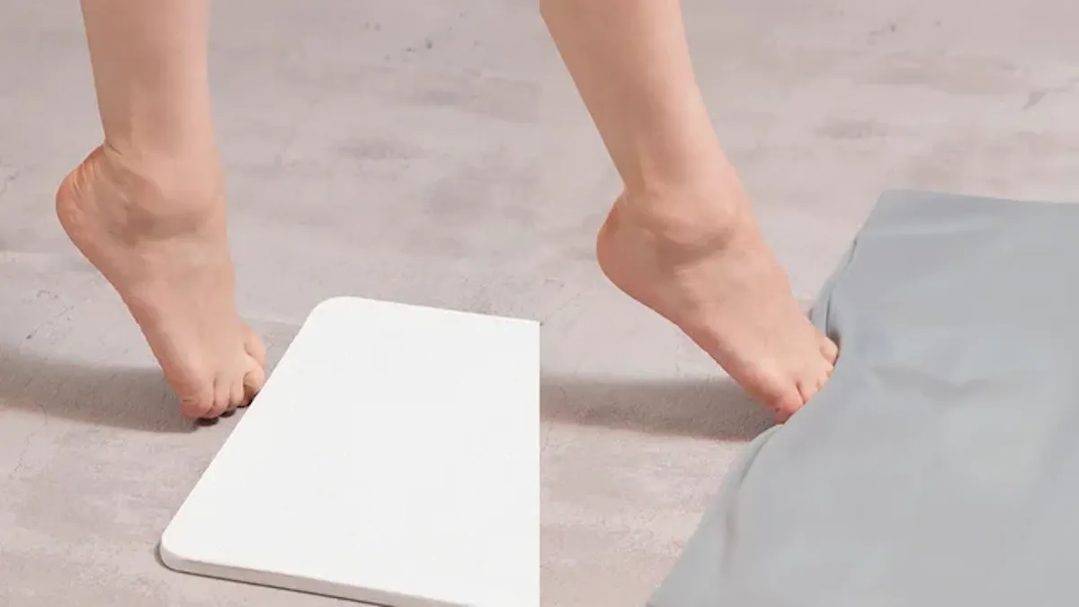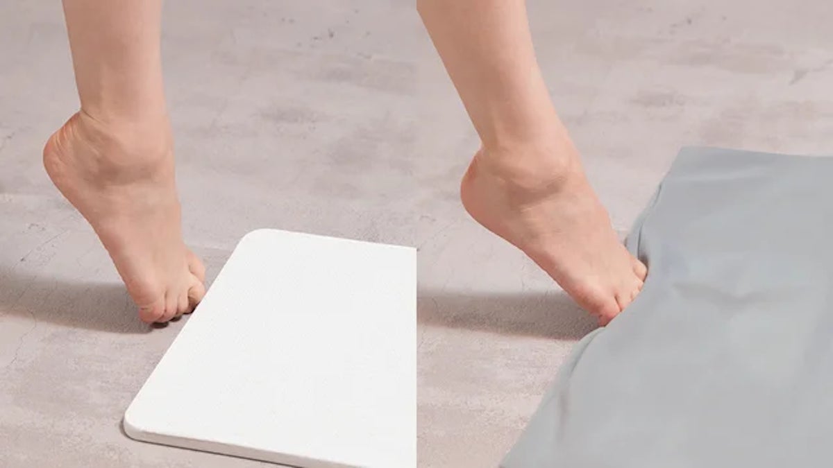 また、上質な生地を採用することで、板状珪藻土バスマットのひんやり硬い踏み心地を ふんわり柔らかいふみ心地に改善する効果もあります。このことは踏み心地を改善するだけでなく、適度に足がバスマットにめり込みため、足の指の間や側面の水滴までも吸水します。