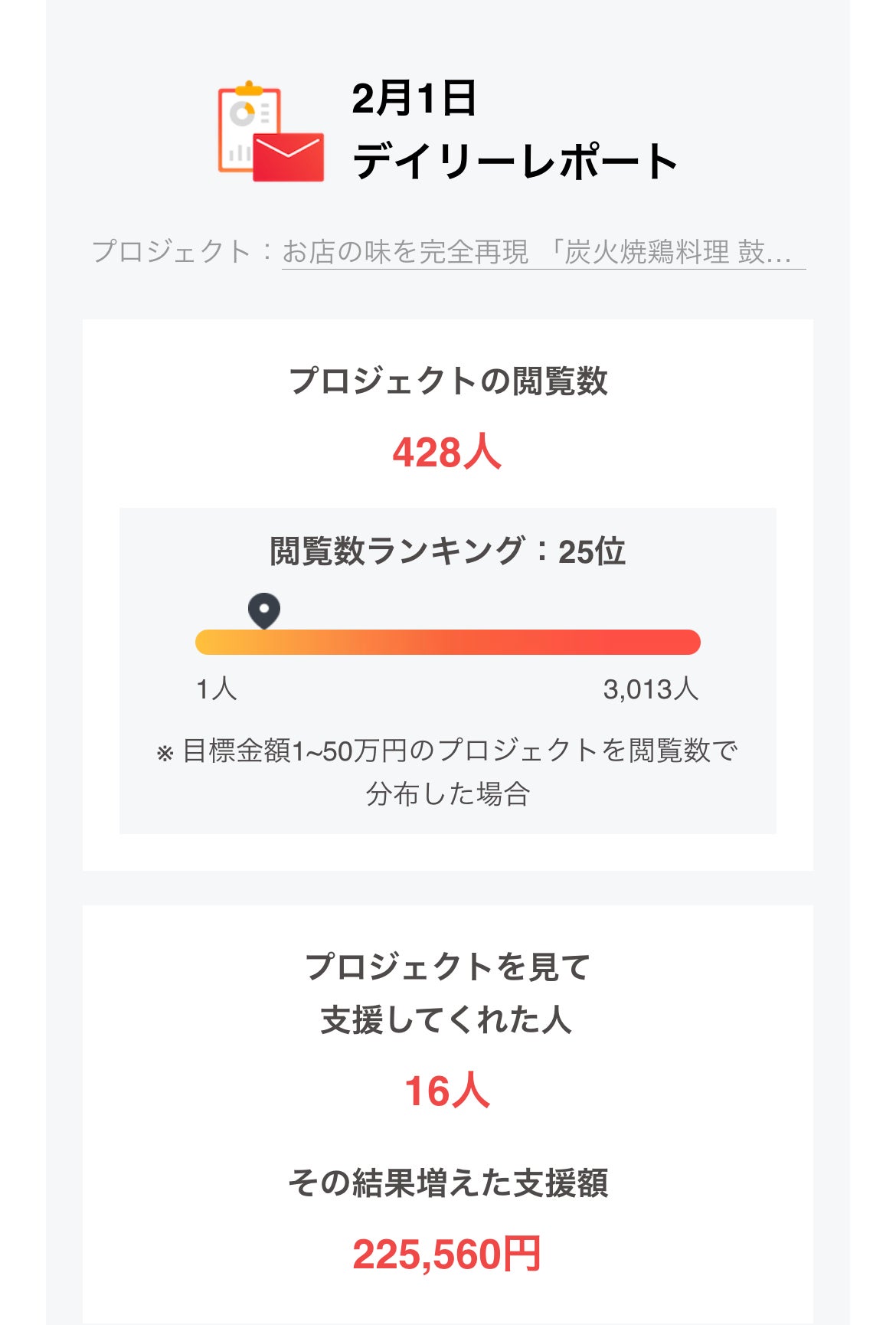 2024/02/02 12:00鼓太郎の料理を全国の皆様にも食べて頂きたい!とはじめたクラウドファンディングの初日が終了致しました。皆様のご支援・ご協力により、数あるプロジェクトの中で観覧数428回・ランキング25位と非常に素晴らしい成績を残す事もでき、初日に達成率45%まで達成する事が出来ました。心より感謝申し上げます。これからも皆様の期待にお応え出来るよう精進して参りますので、変わらぬご支援・ご協力をお願い致します。また、YouTubeのチャンネル登録やSNS等でのいいねを押して頂くと大変励みになります。重ねてお願い申し上げます。 もっと見る