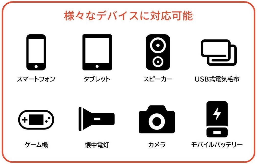 スマートフォン、タブレット、スピーカー、USB式電気毛布、ゲーム機、懐中電灯、カメラ、モバイルバッテリーなど、USB-CやUSB-Aを使って充電する様々なデバイスの充電が可能です。