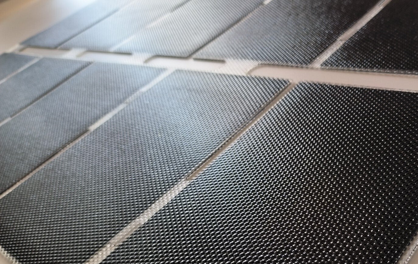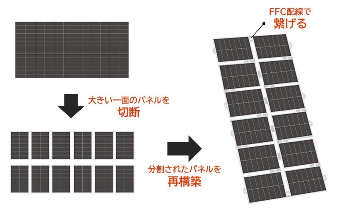 大きい一面のソーラーパネルを切断後、分割された小さいパネルを繰り返しの屈曲に耐える頑丈なフレキシブルフラットケーブル(FFC)で繋げて再構築し、畳んで持ち運べるコンパクト性を実現しました。