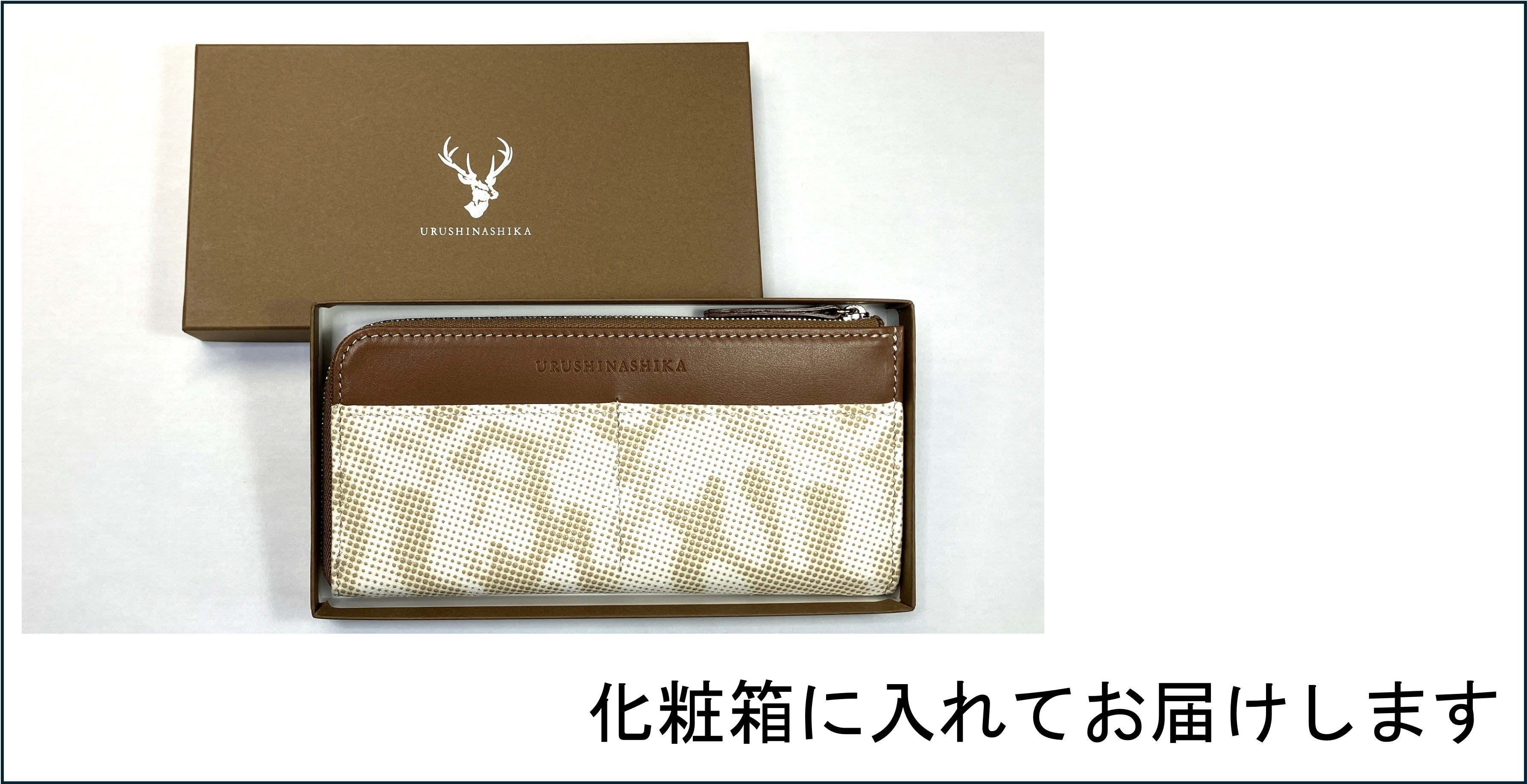 「URUSHINASHIKA」商品の印伝加工(漆付け)は「甲州印伝 伝統工芸士」の資格を持つプロが、又、縫製は日本鞄ハンドバッグ協会から1級に技術認定された鞄作りのプロが担っていて、Made in Japanです。  色は『白』を基本色としていますが、汚れにくいように撥水加工を3回施すなど印伝用に適した工夫が加えられています。