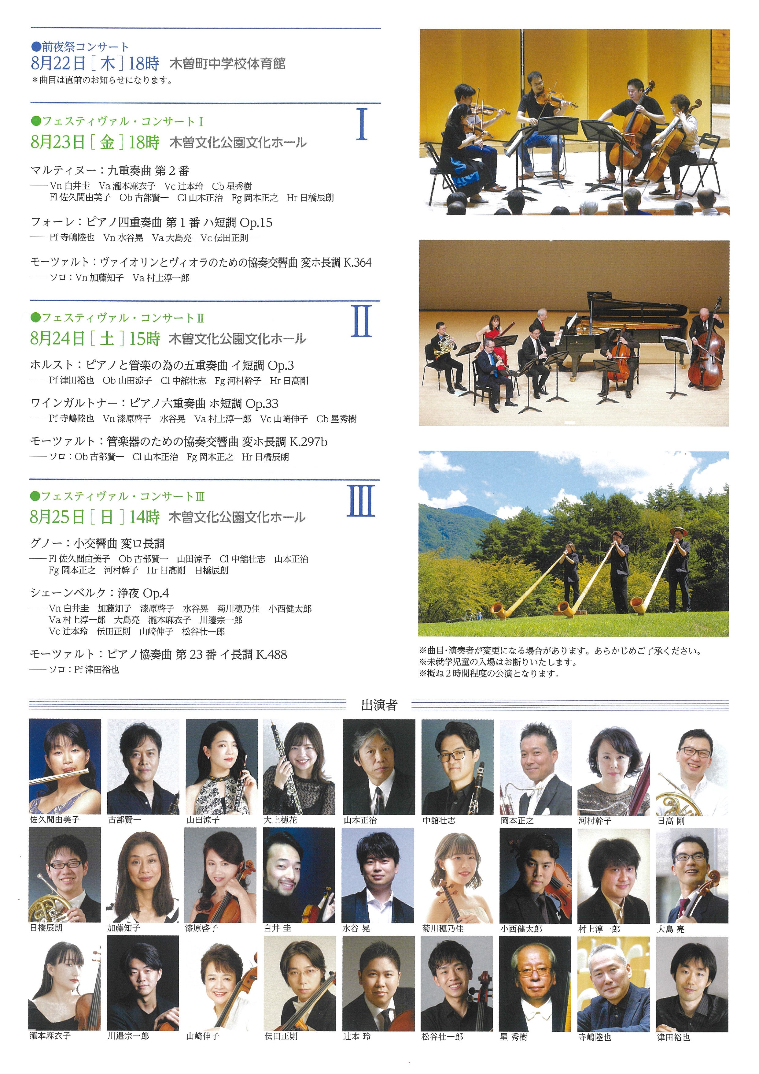 この記念すべき『第50回木曽音楽祭』を盛り上げるべく、例年より人数を増やし小編成のオーケストラによる演奏を行います。また、地域の子供達にクラッシック音楽をより身近に感じてもらえるように、演奏家が地元の小・中学校へ訪問して演奏も行います。