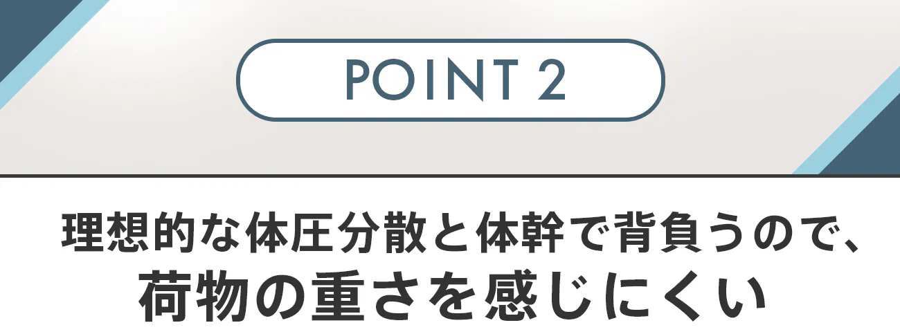 また「姿勢垂直システム」により体を真っすぐに保つため、体幹で荷物を支え重さを体全体に分散します。