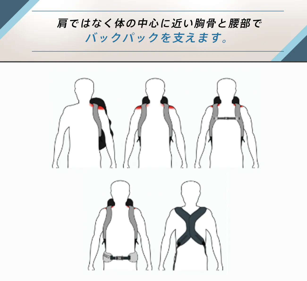 これによりバックパックを背負っても体のラインを自然な形で真っ直ぐに保ち、悪い姿勢に伴う首や肩、背中、腰に掛かる負担を圧倒的に軽減。