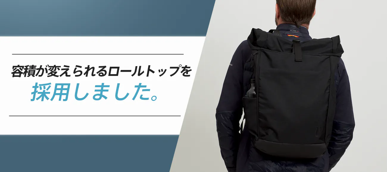 【Vertical Ergonomic Backpack】は中の荷物に合わせて容積が変えられるロールトップを採用しました。